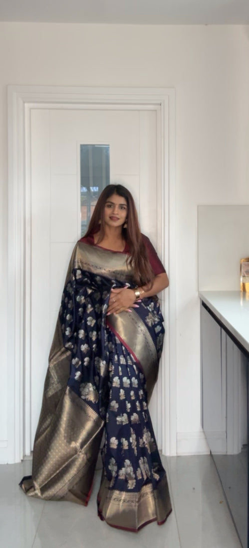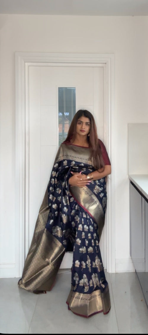 Semi Banarasi silk Saree with rich pallu and blue colour plain blouse