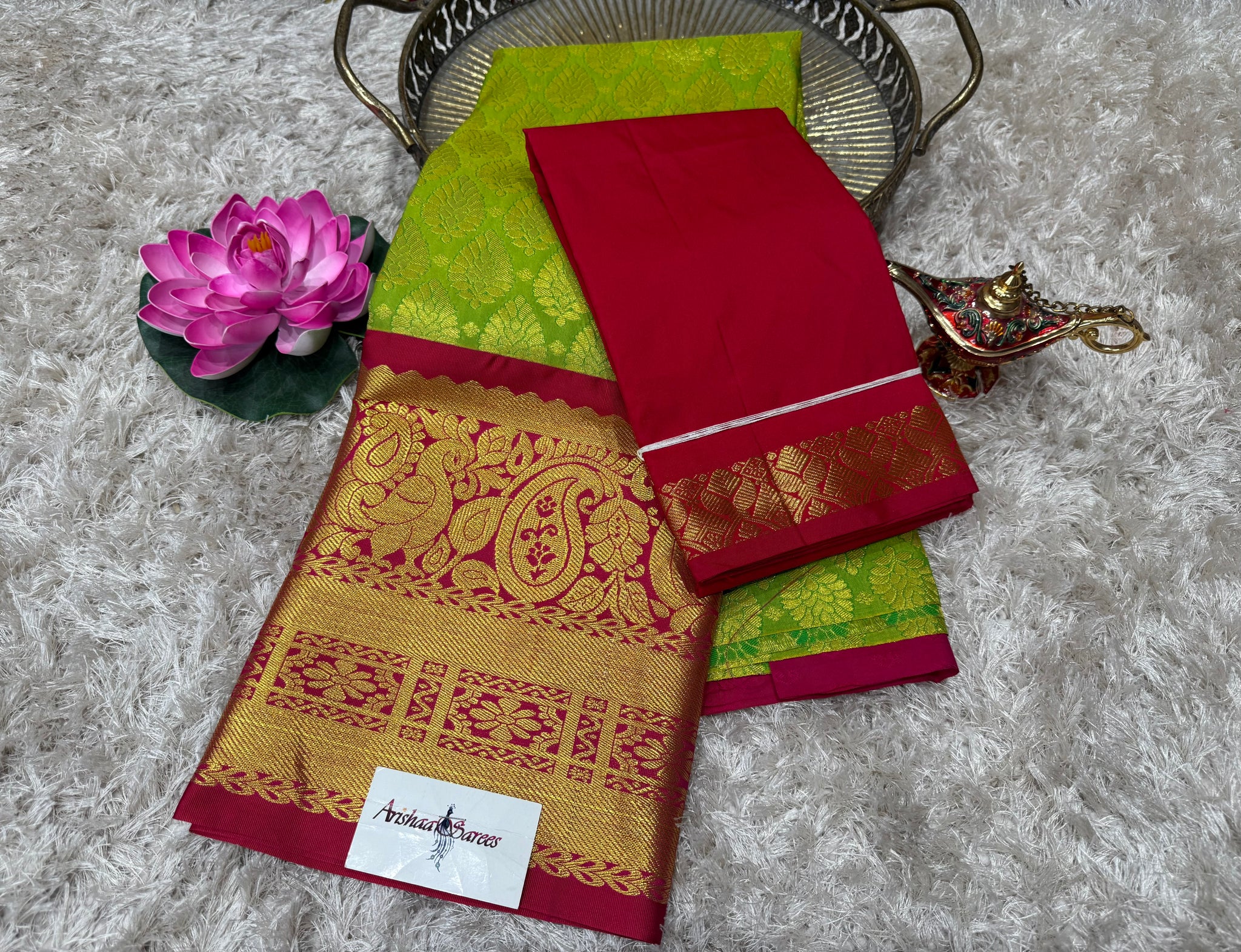 parrot geen half Saree with reddish pink border, blouse and reddish pink Thavani