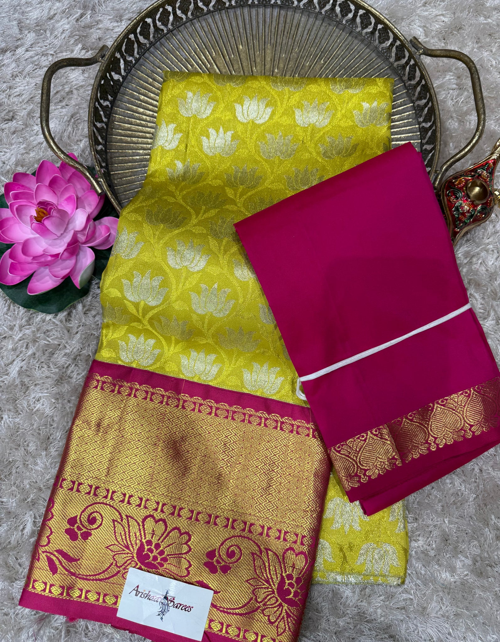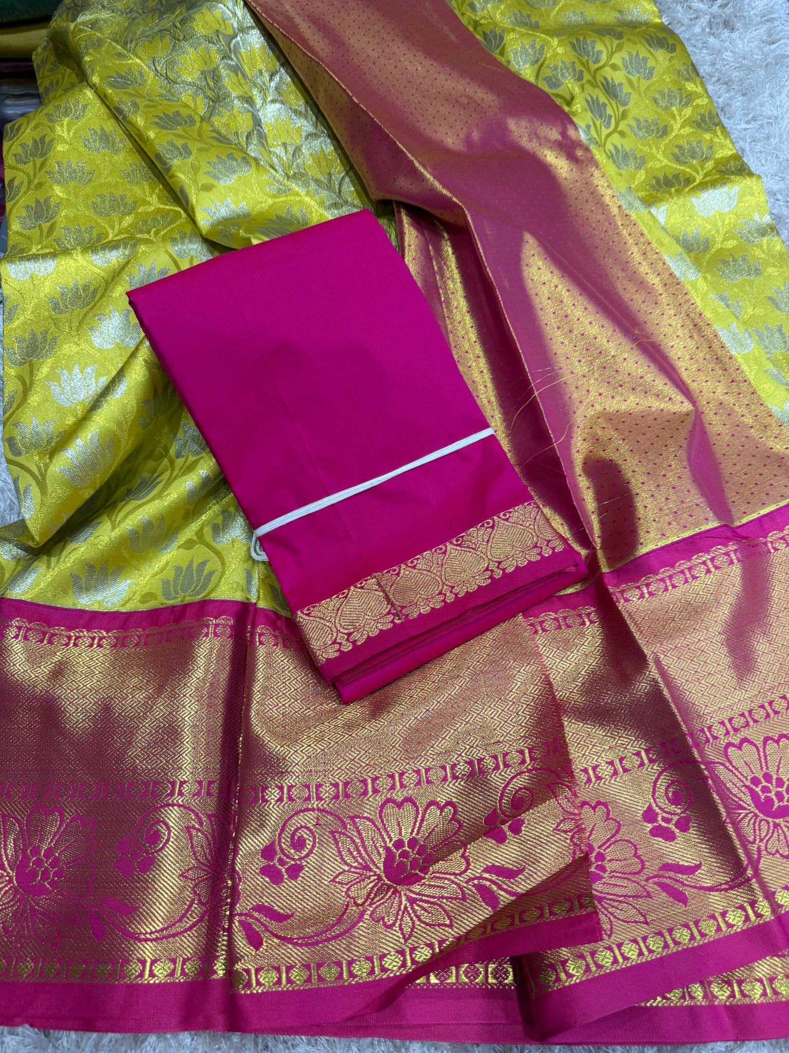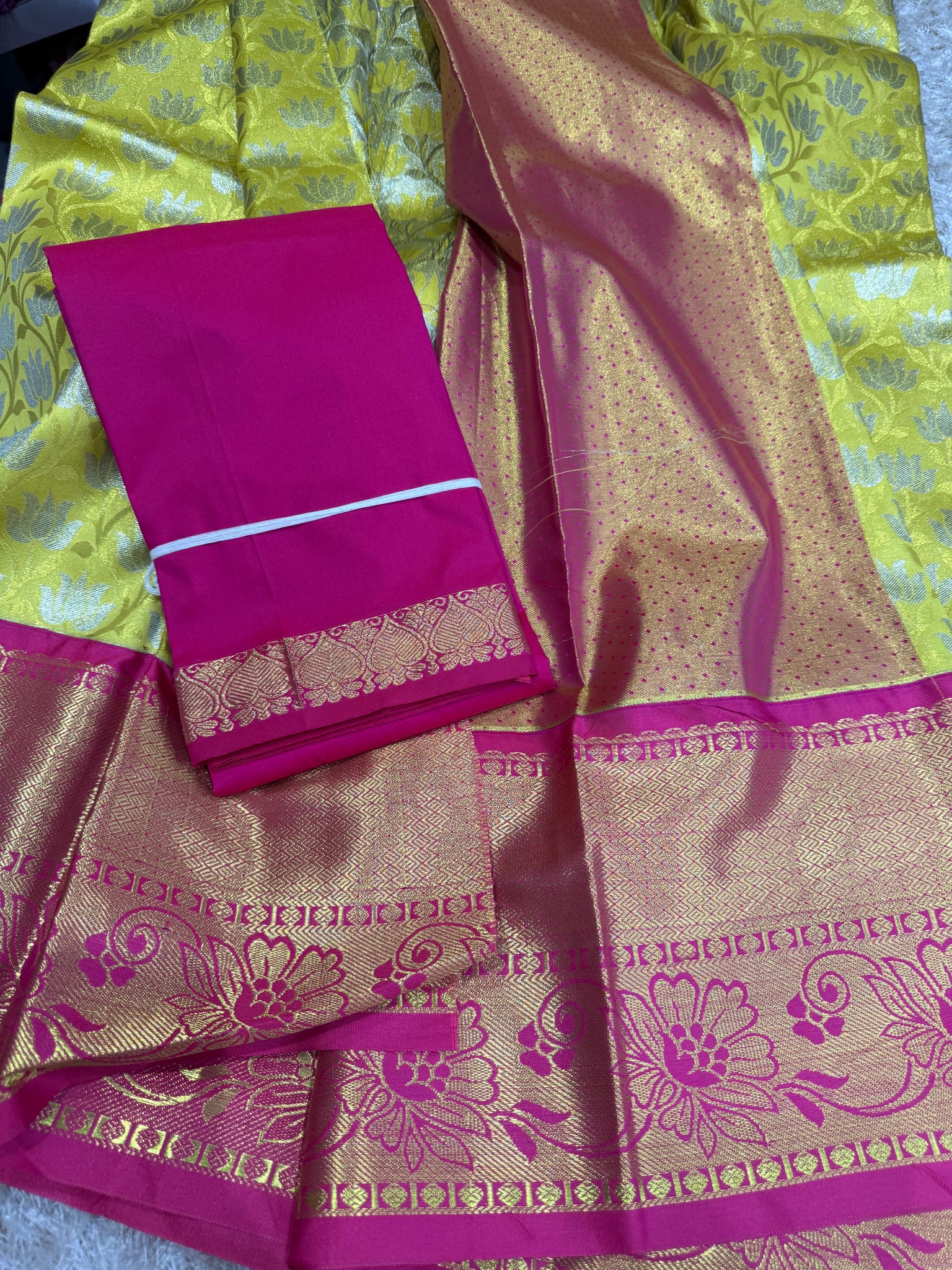 Yellow half Saree with pink border, golden pink blouse with pink Thavani