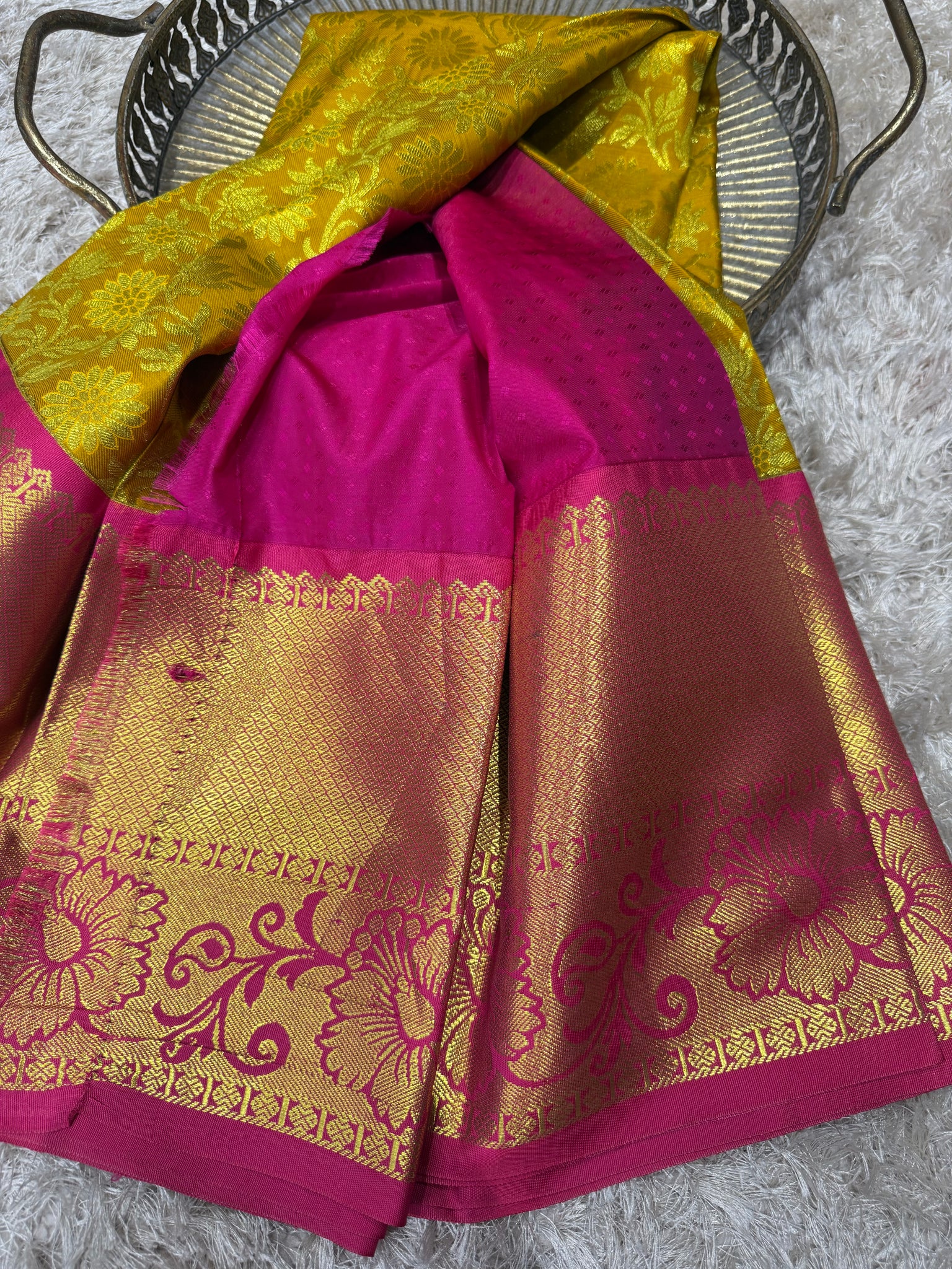 Mustard Pattu half saree with pink border, pink blouse and pink Thavani