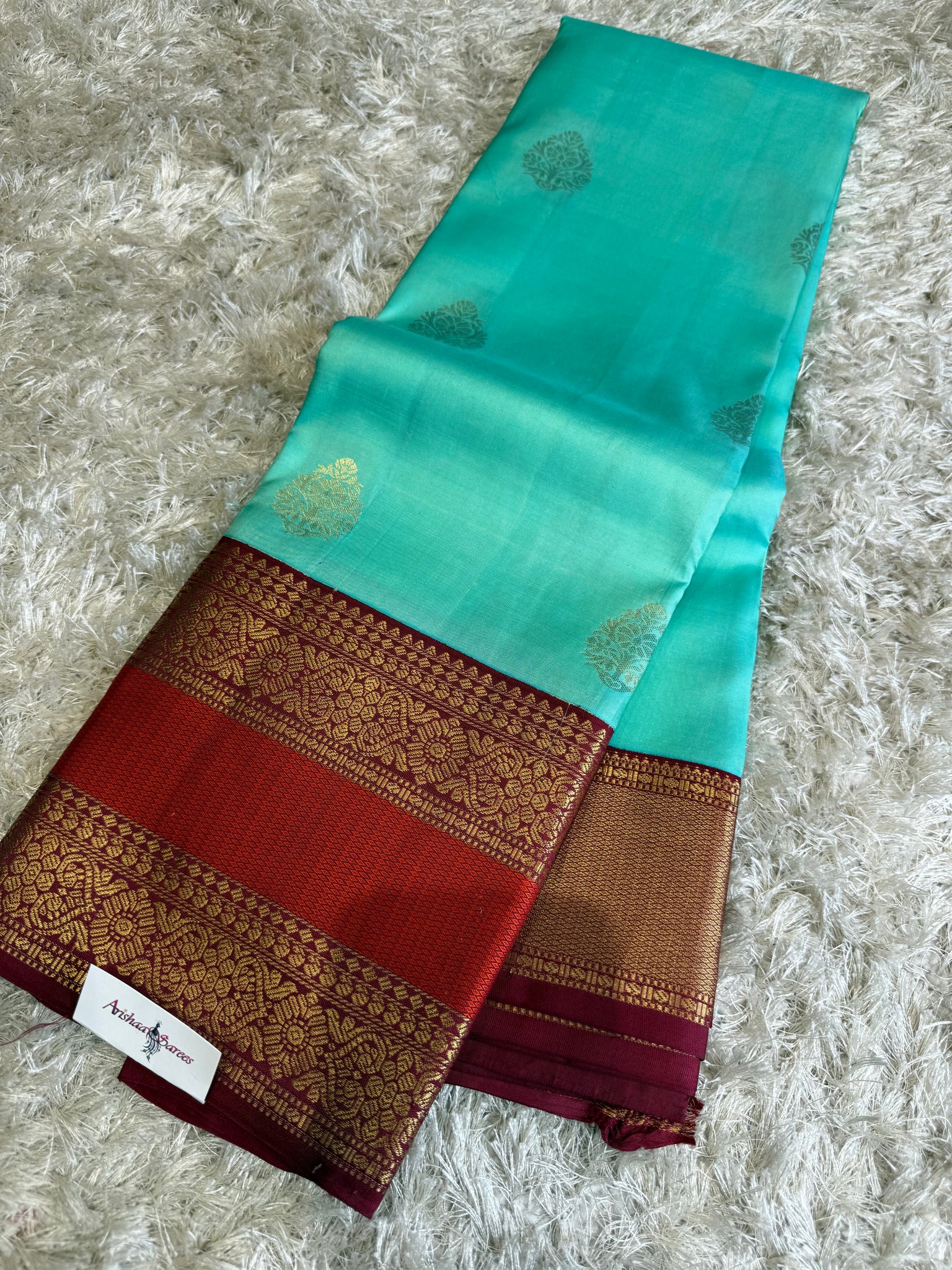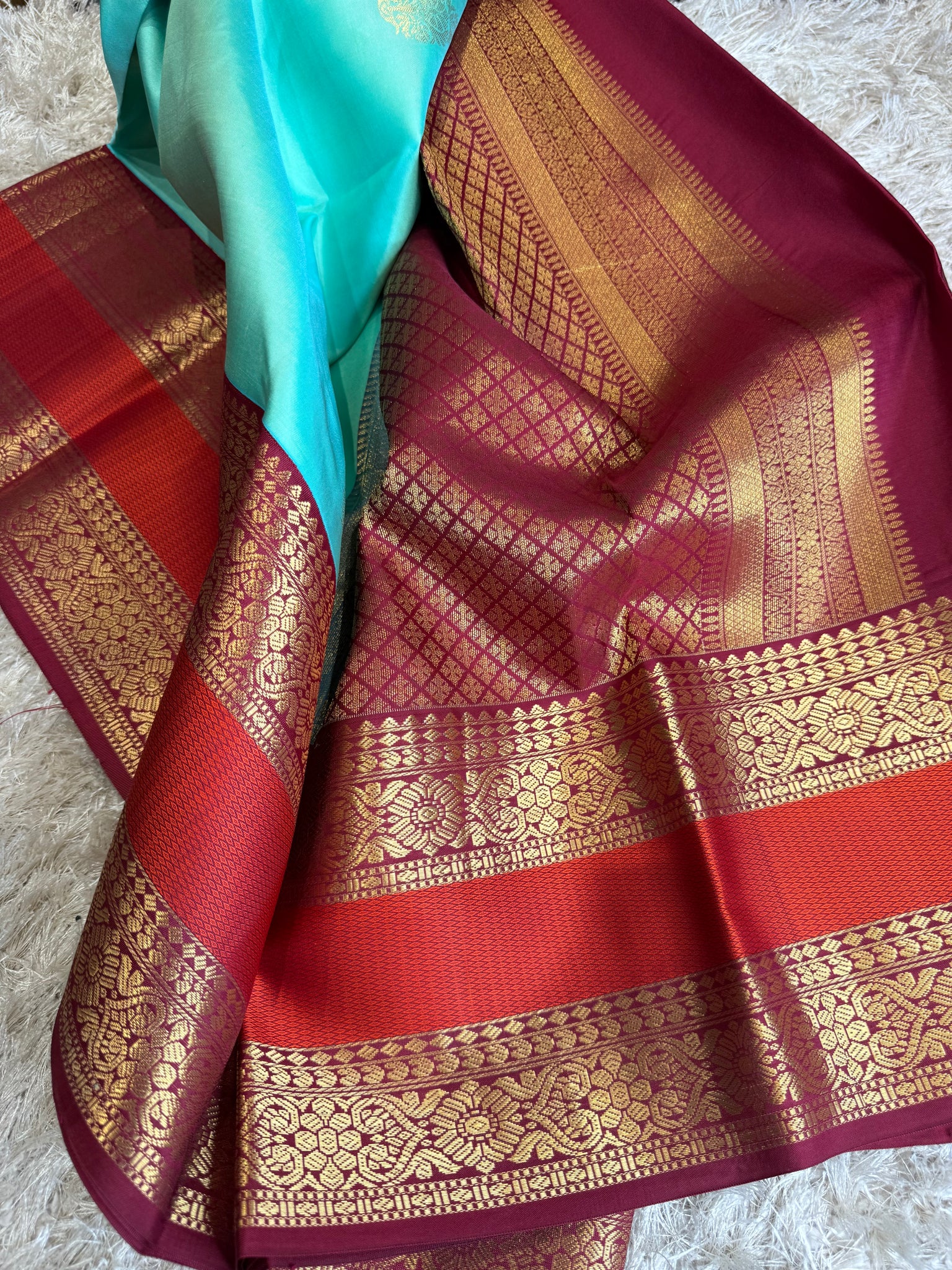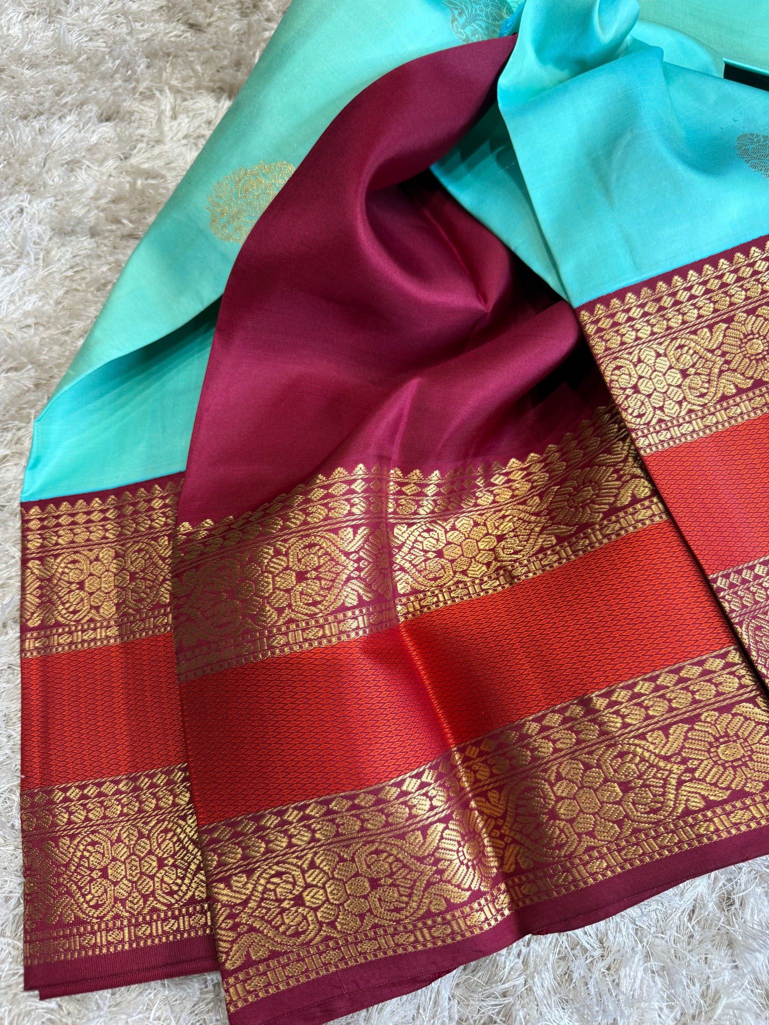 pure Kanchipuram silk saree with beautiful contrast korvai border and maroon blouse