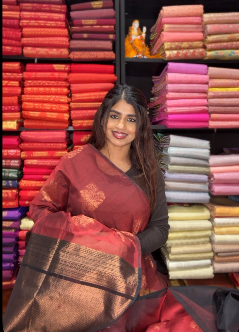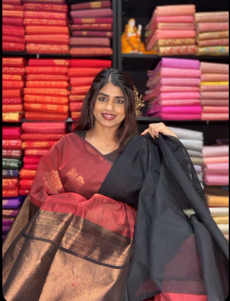 Maroon silk cotton sareecones with black pallu and black plain blouse