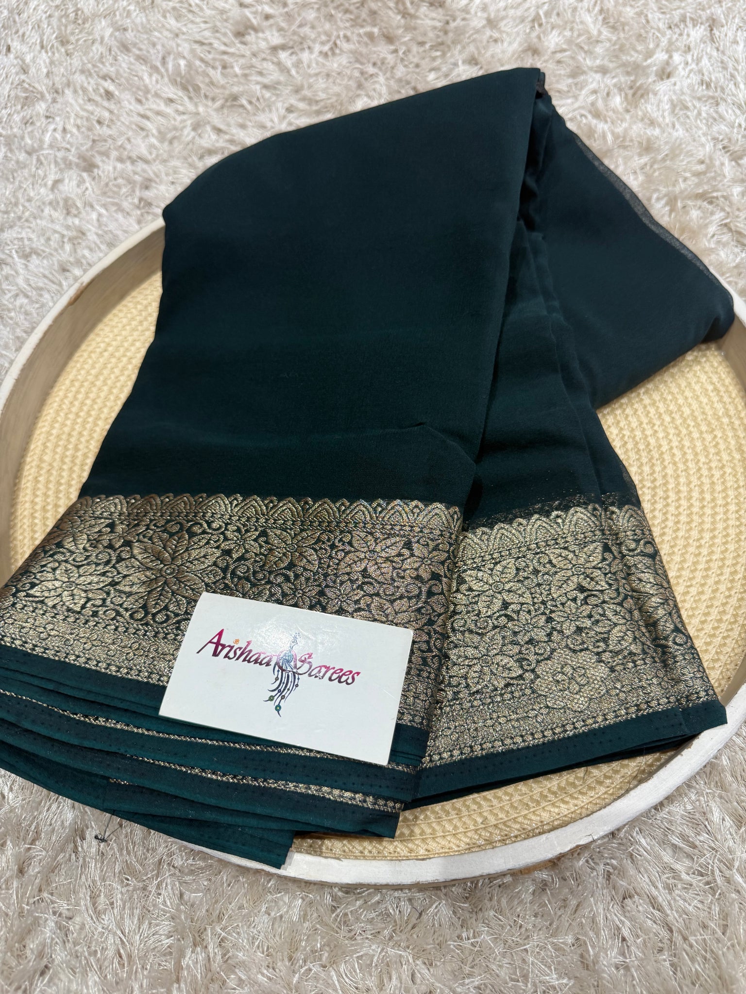 Dark green chiffon Saree with Banarasi border comes with running blouse