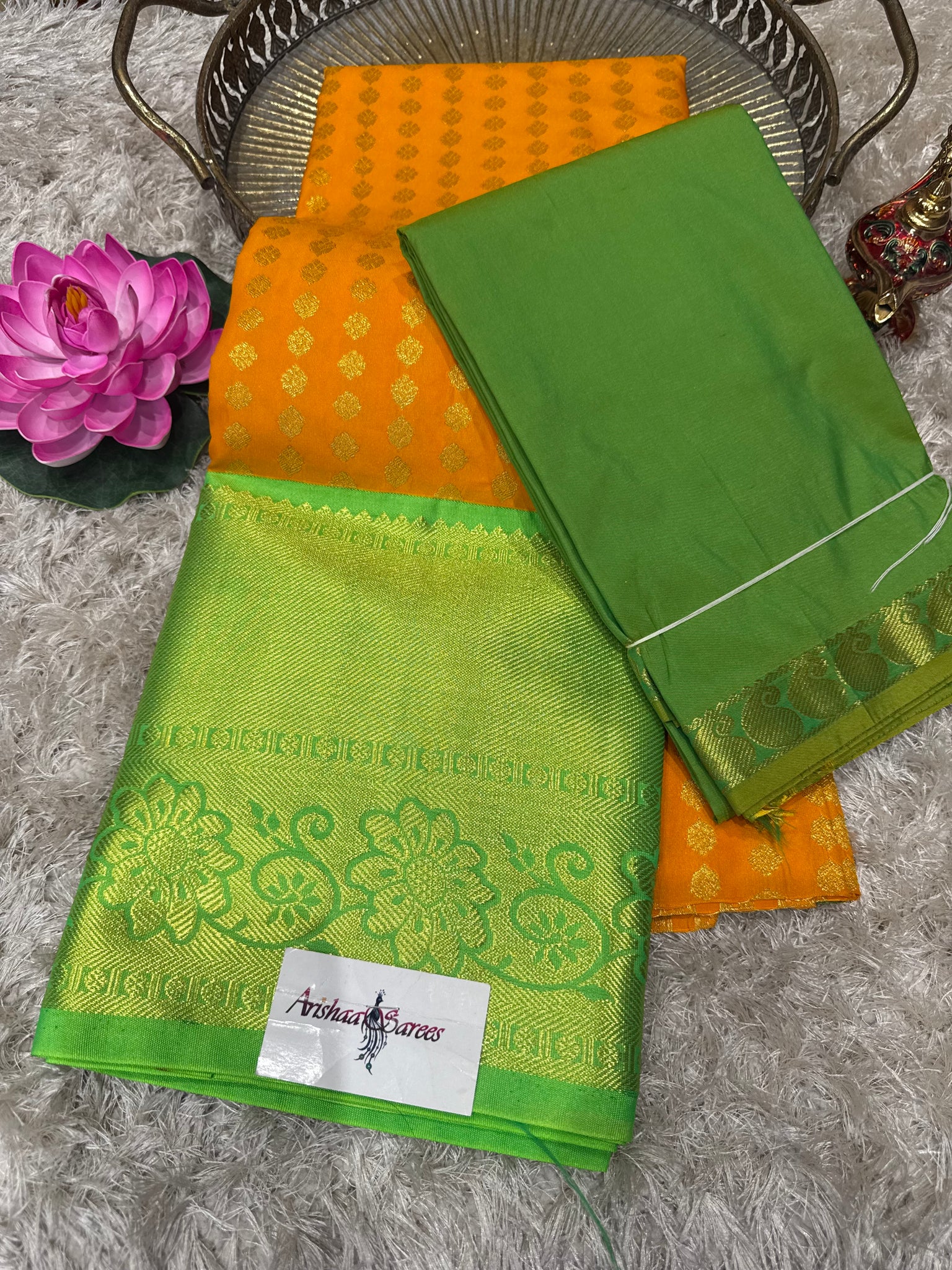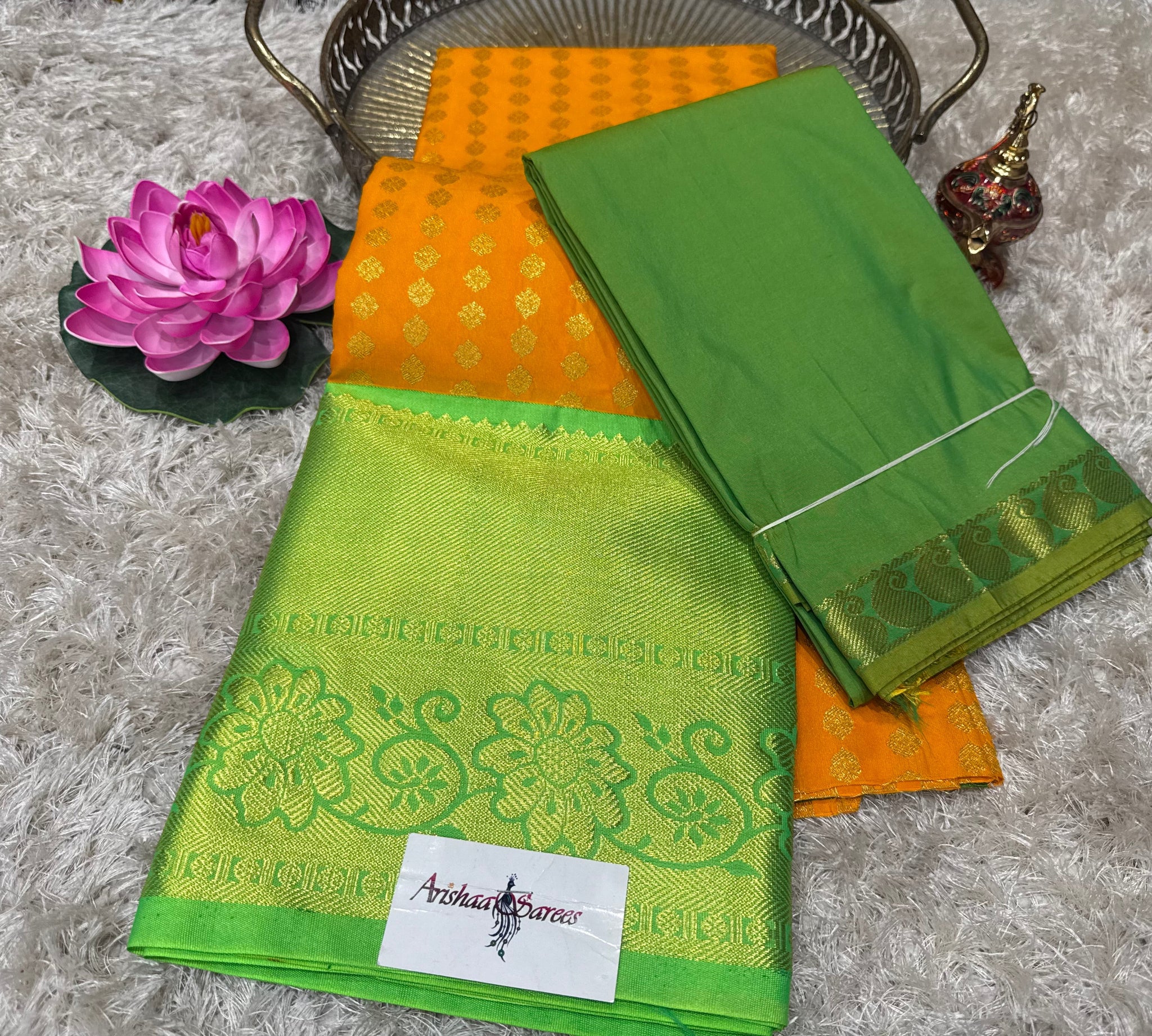 Orange half saree with green border, green brocade blouse and green Thavani