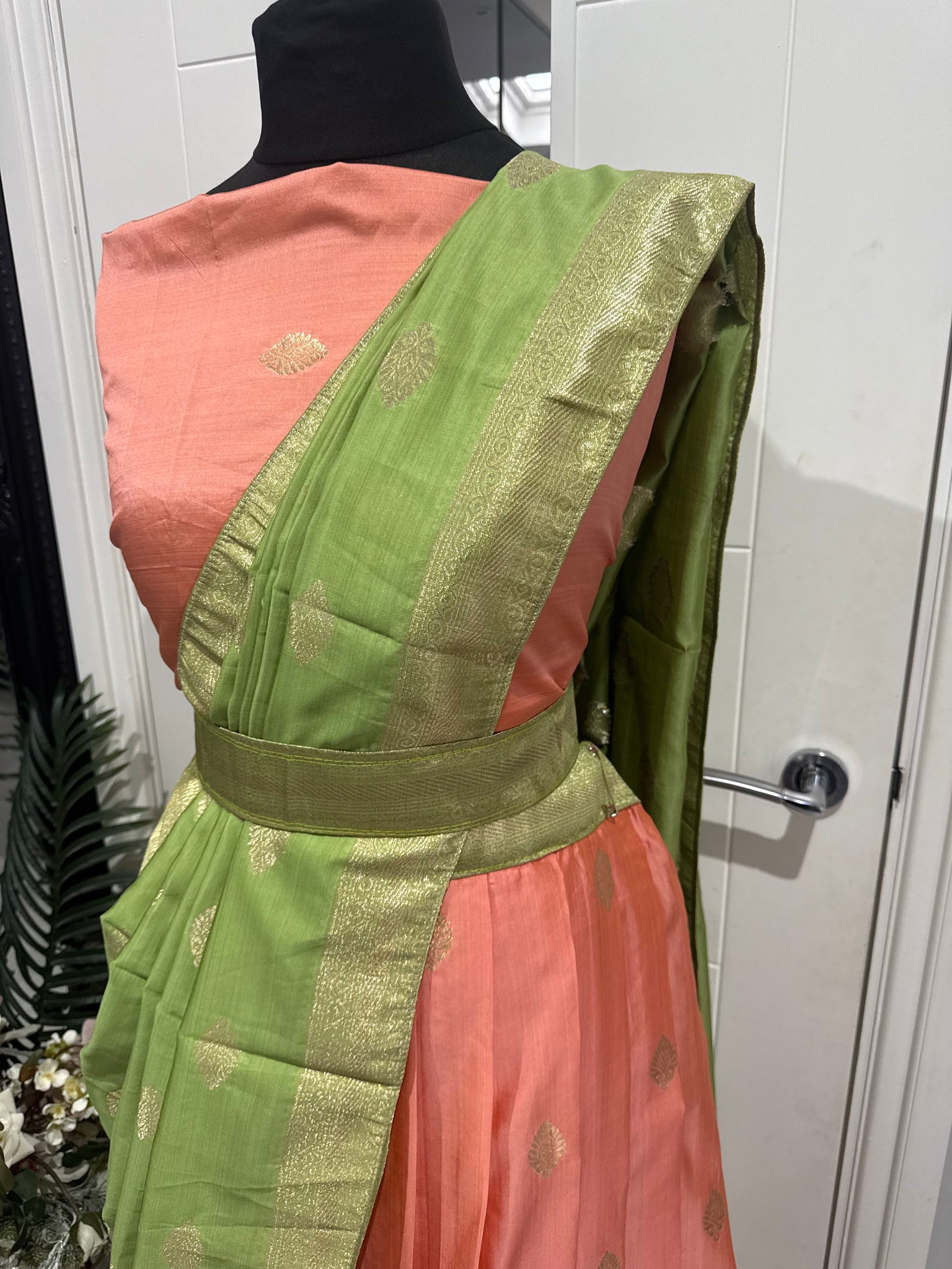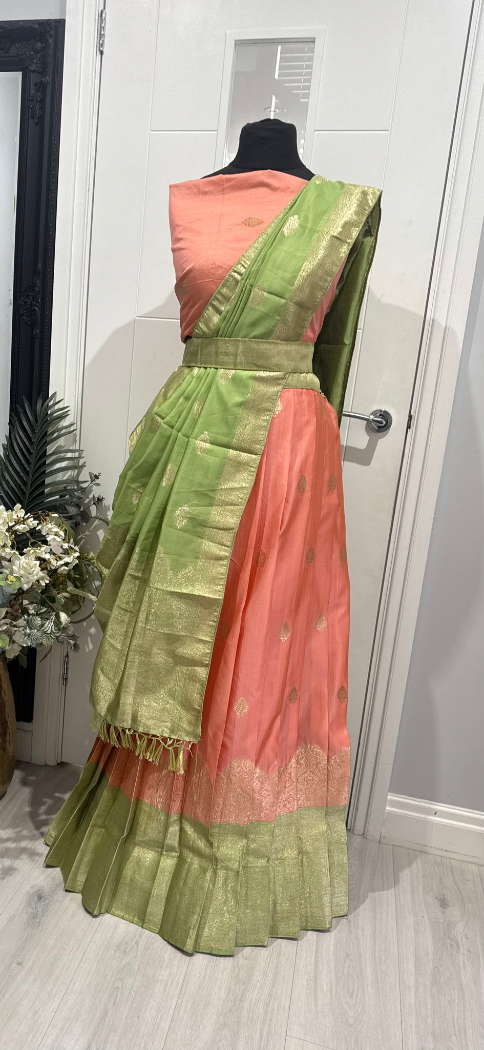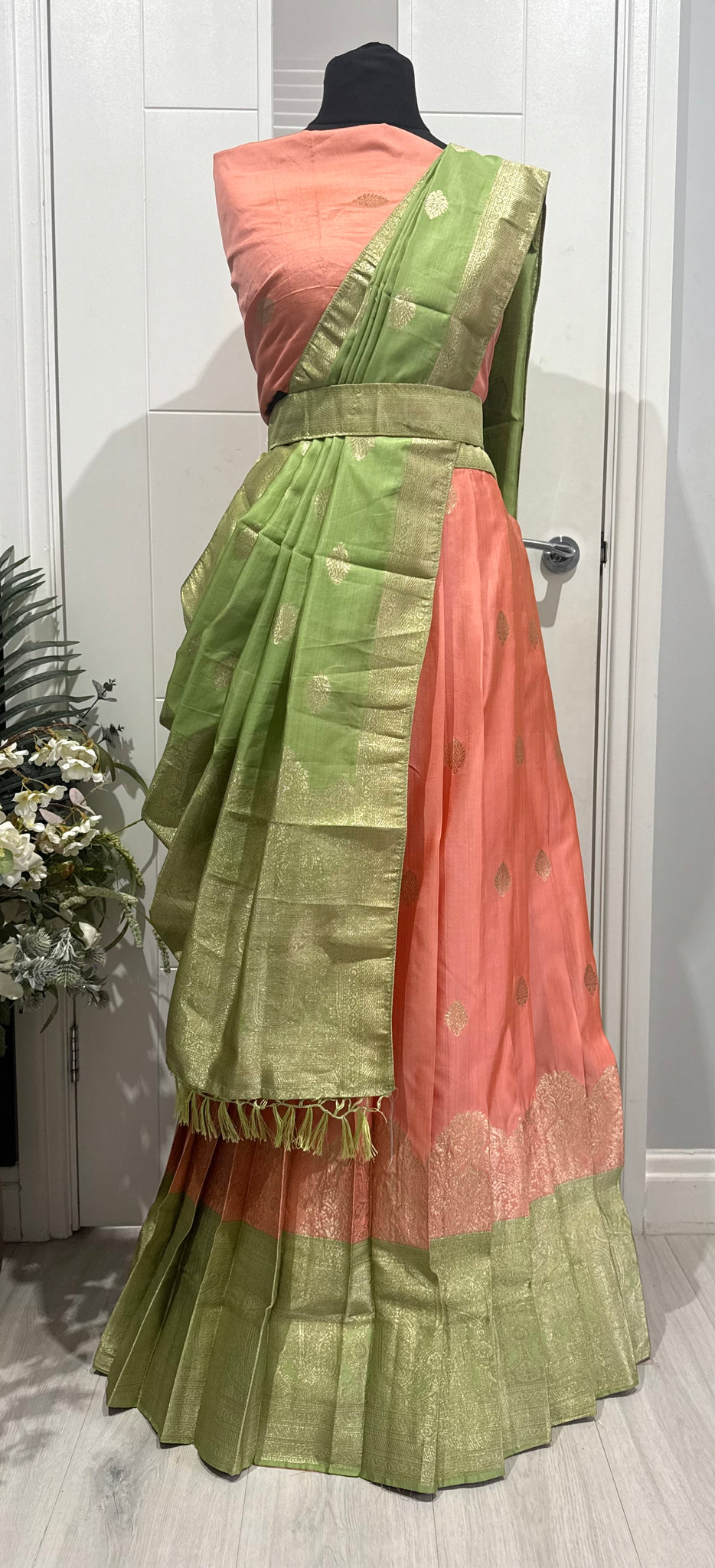 Peach with green border semi stitched half Saree with Banarasi Thavani