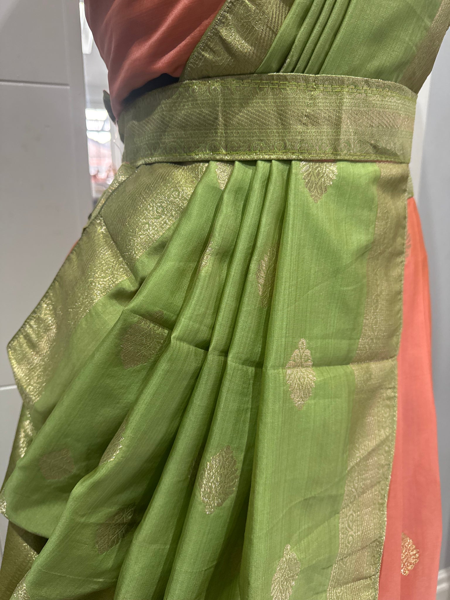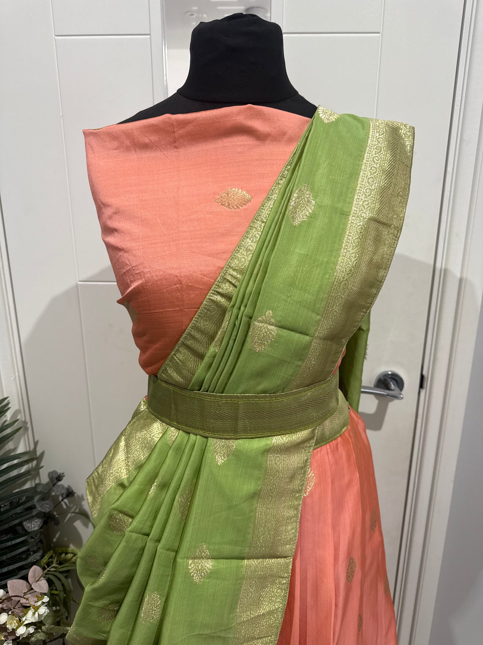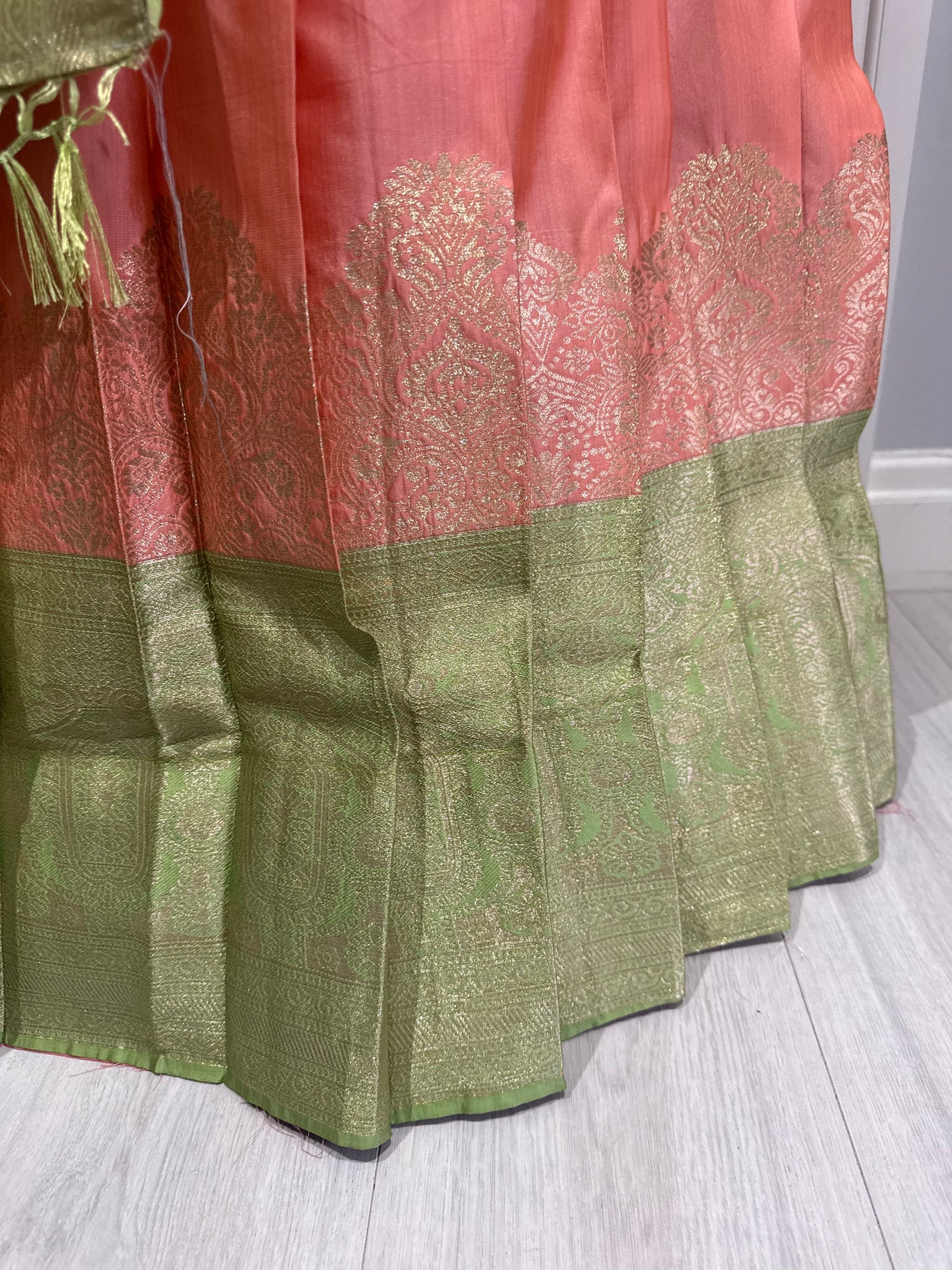 Peach with green border semi stitched half Saree with Banarasi Thavani