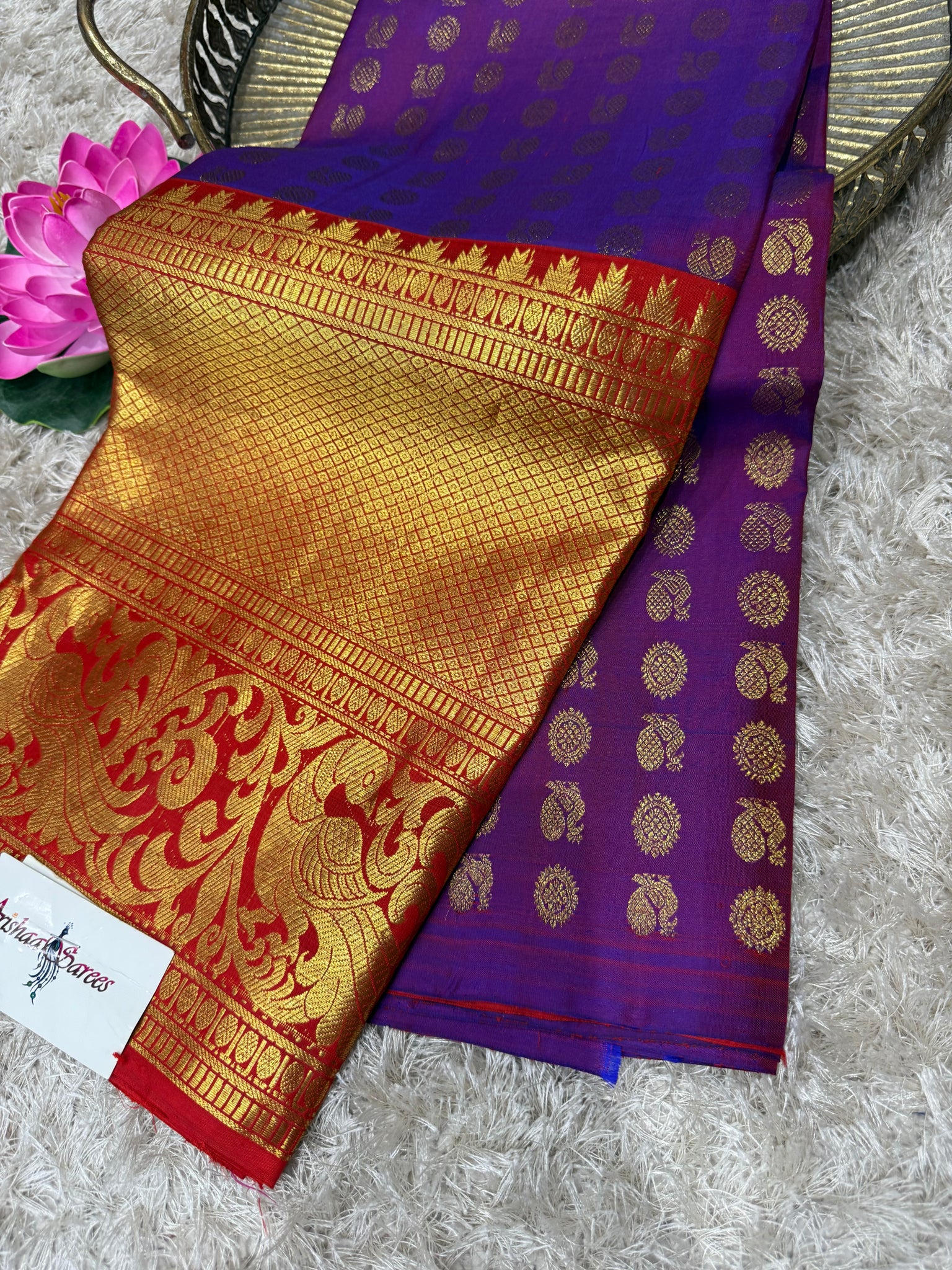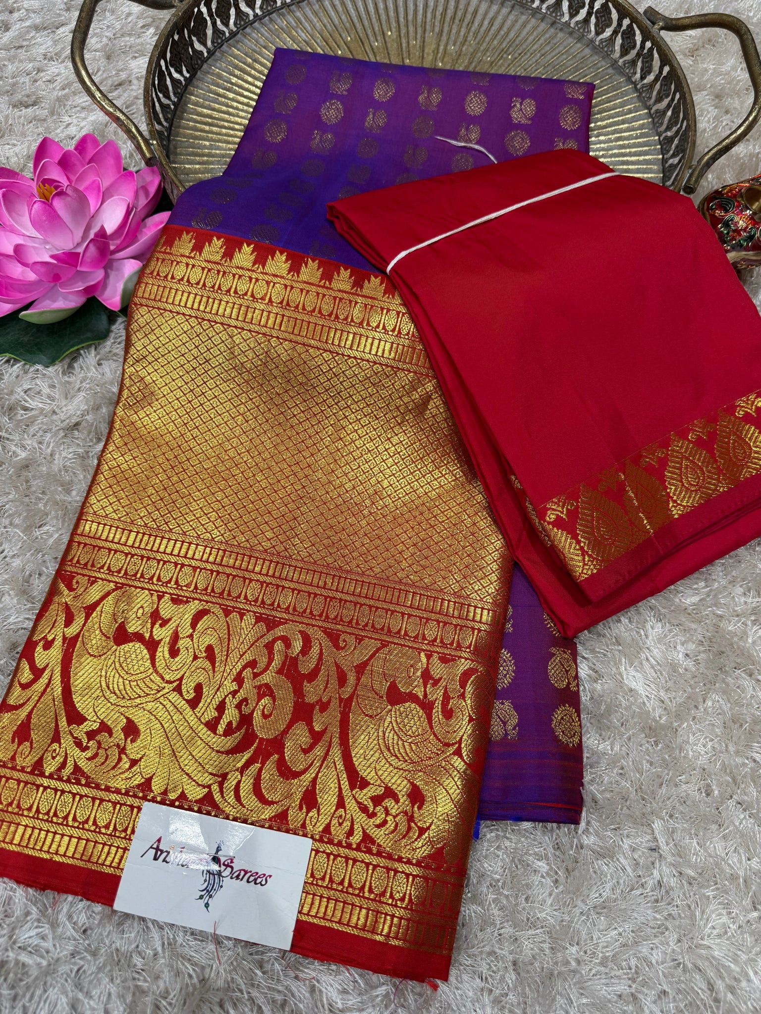 Purple Kanchipuram silk half Saree with red long border, red blouse and red Thavani