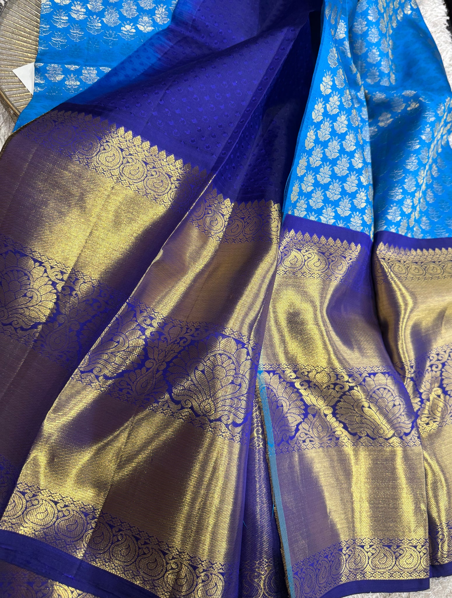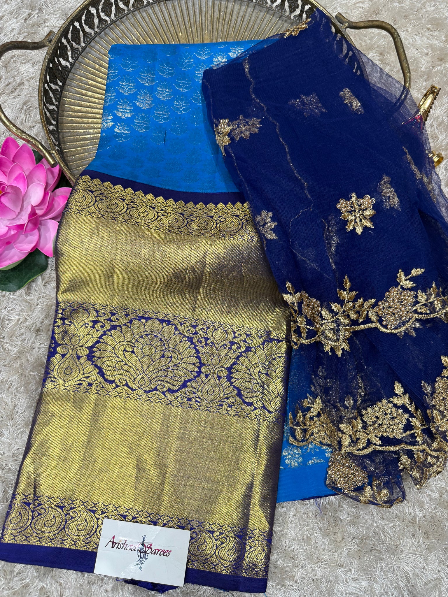 Blue Kanchipuram half Saree with work netted Thavani