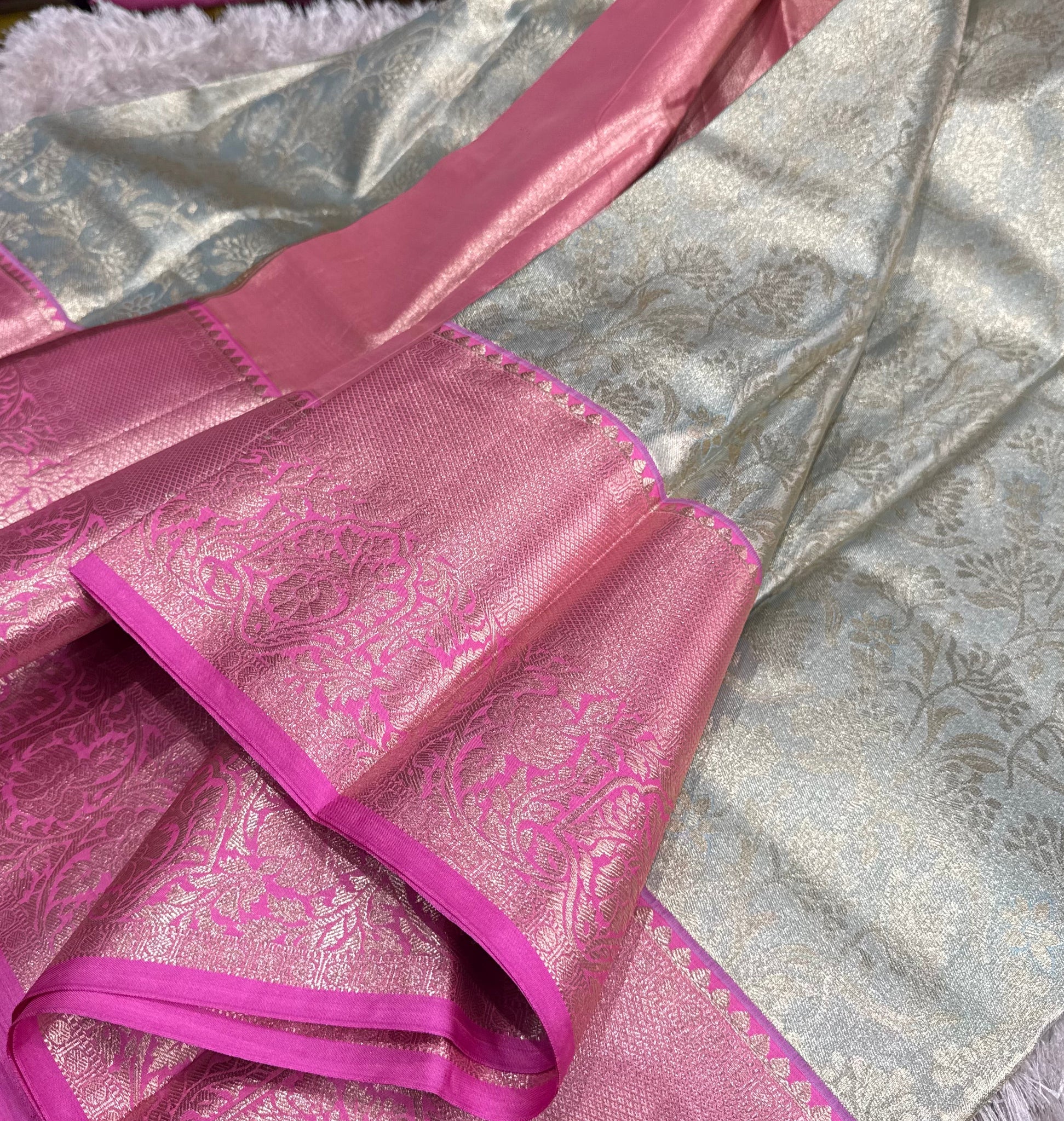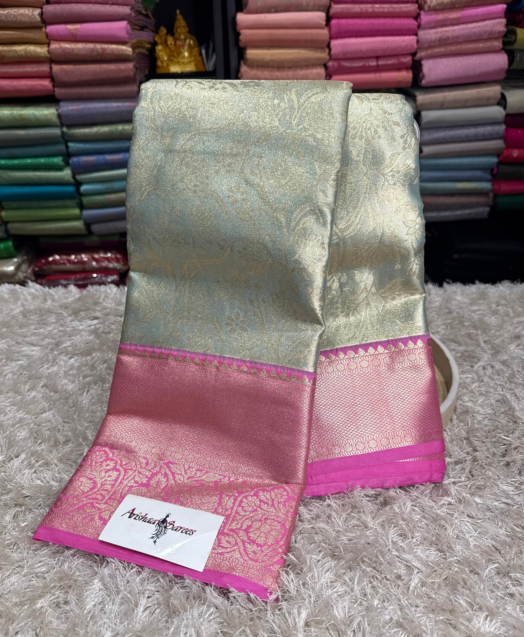 Pastel green Kanchi tissue silk Saree with contrast border and blouse