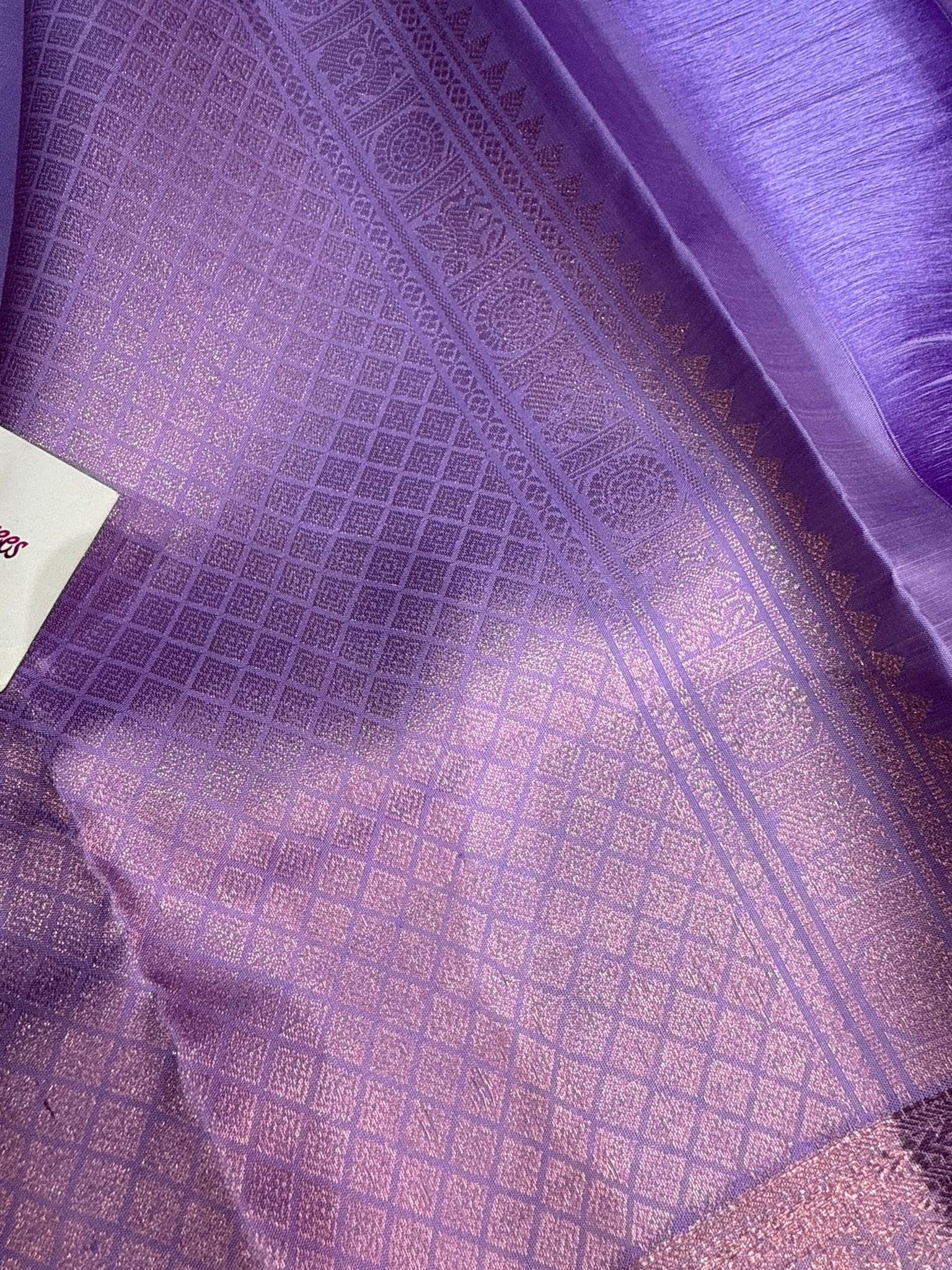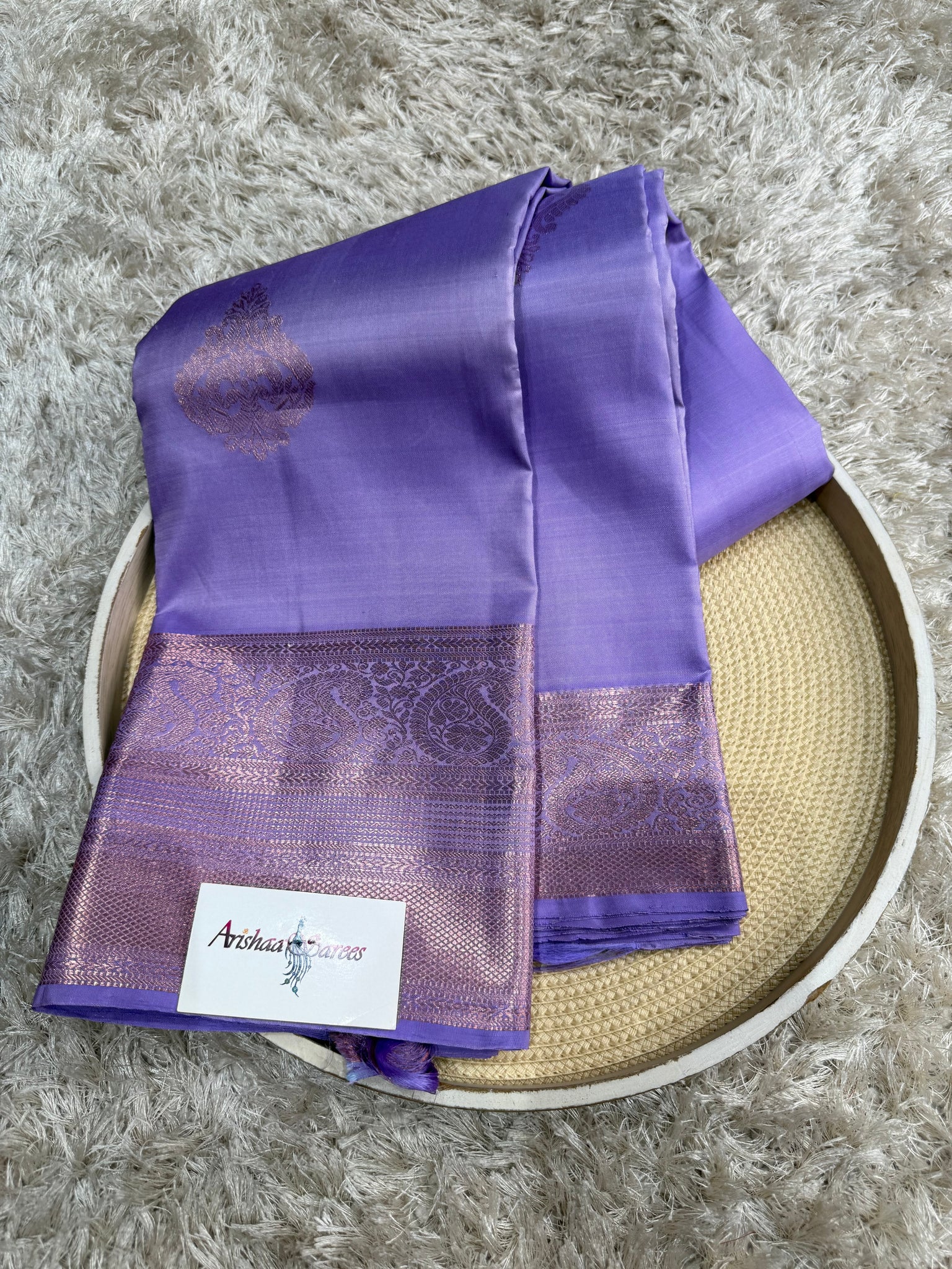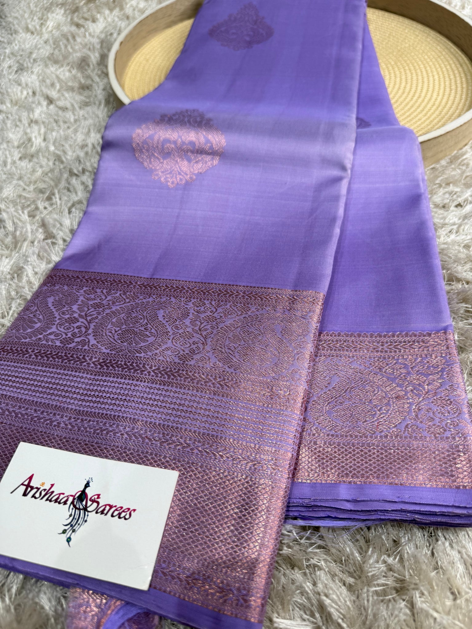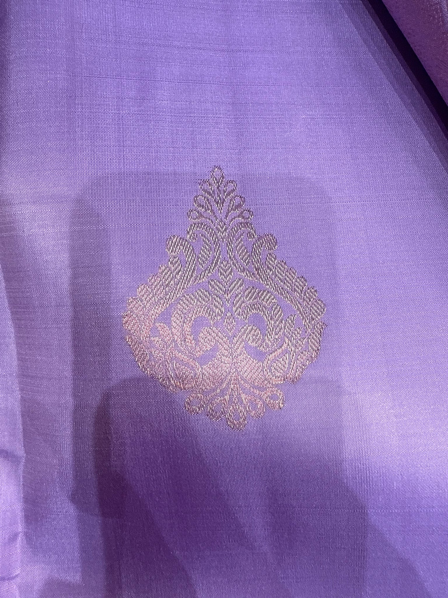 Lavender Kanchipuram silk saree with rose gold jari border and self colour blouse