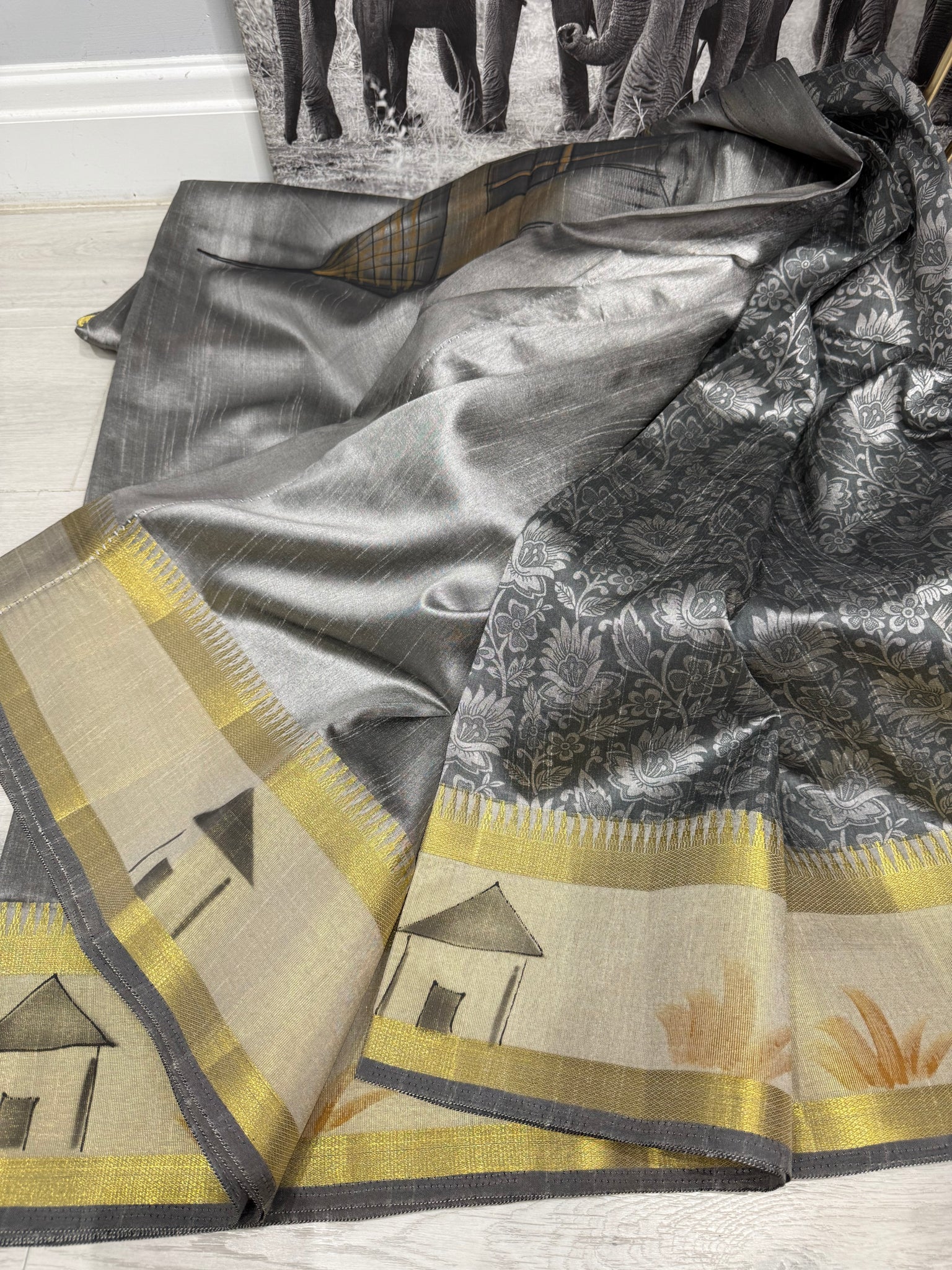 Grey body printed raw silk saree with beautiful pallu and plain grey blouse