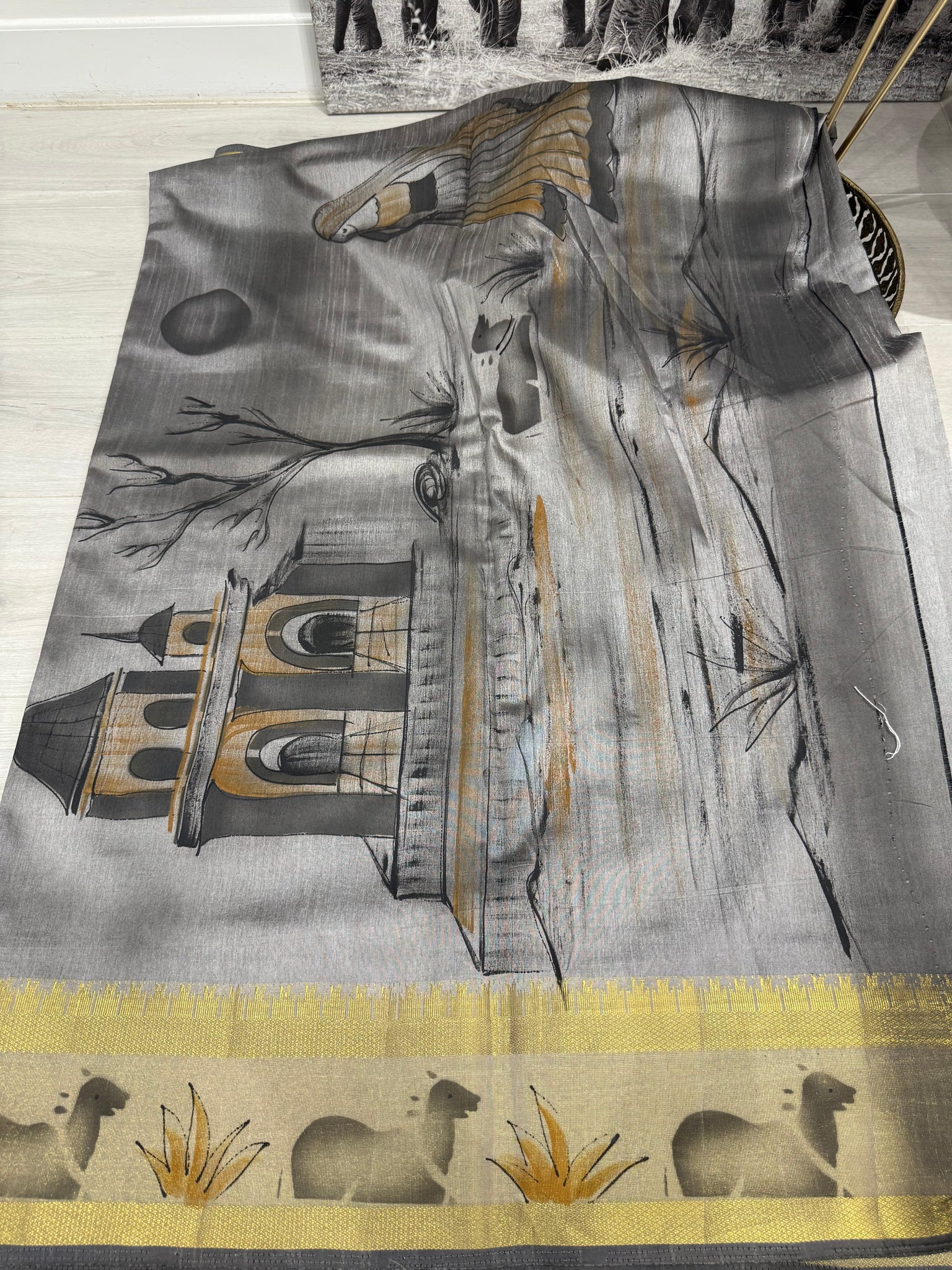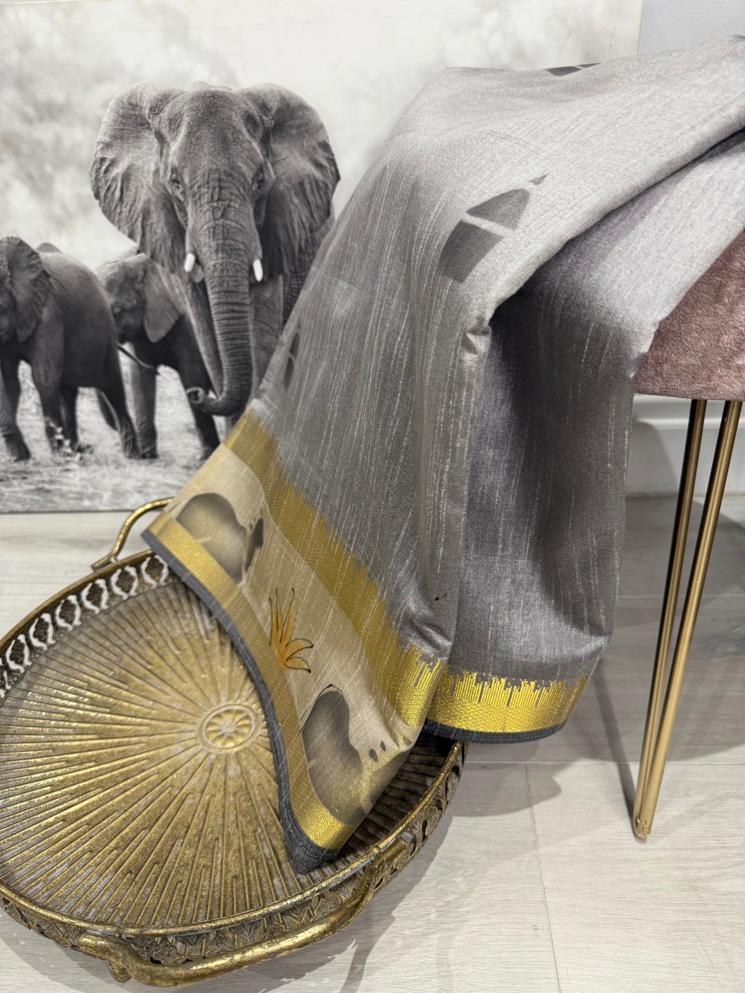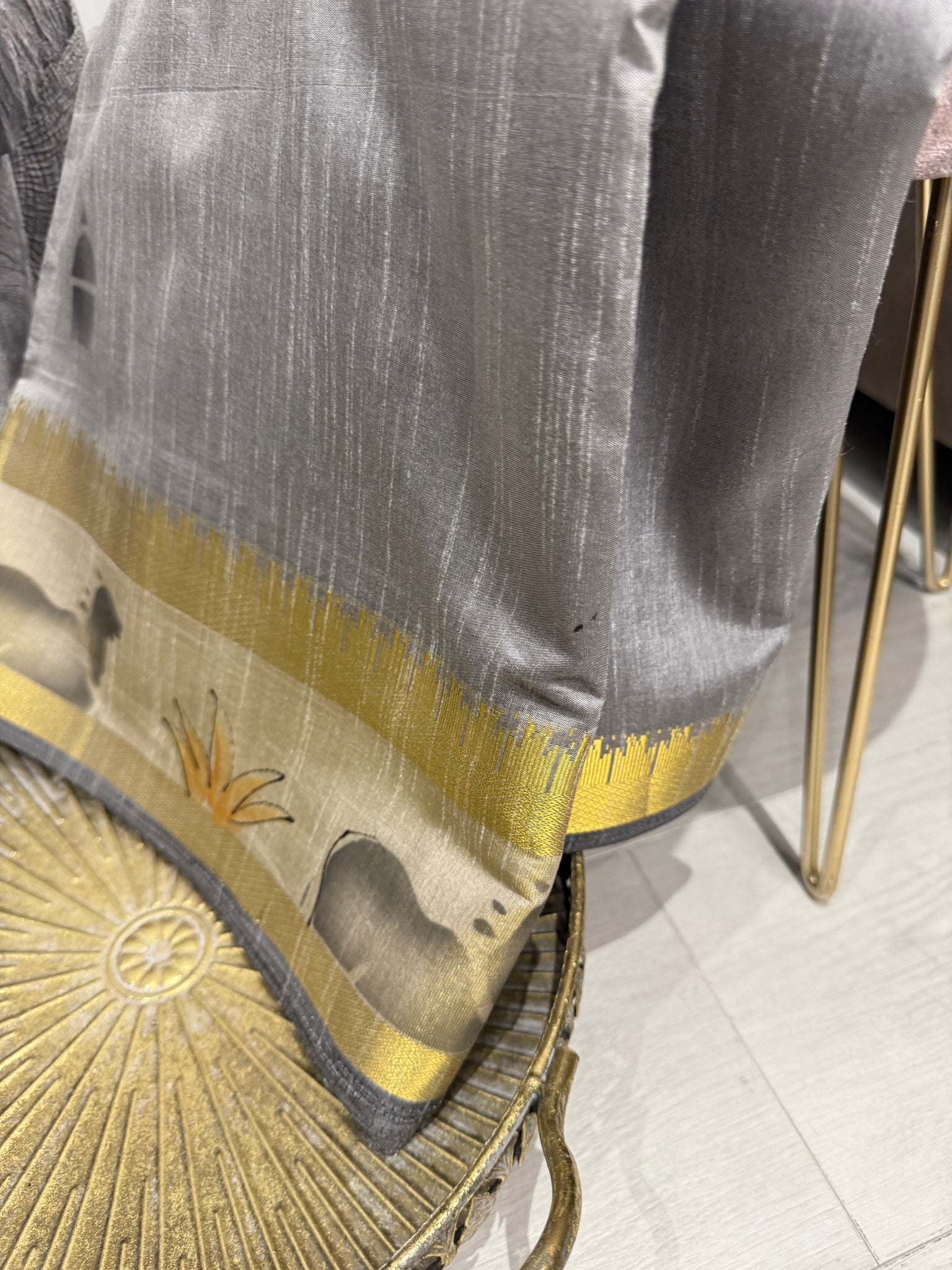 Grey raw silk saree with unique border and pallu design / running blouse