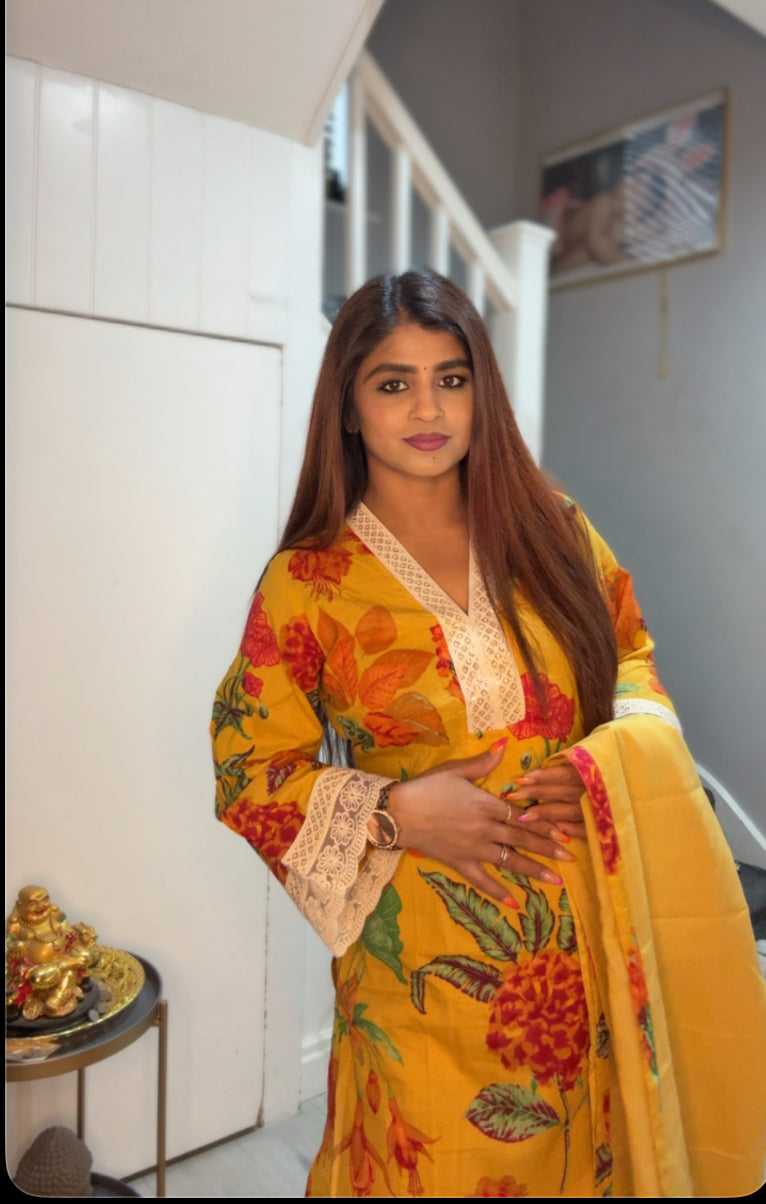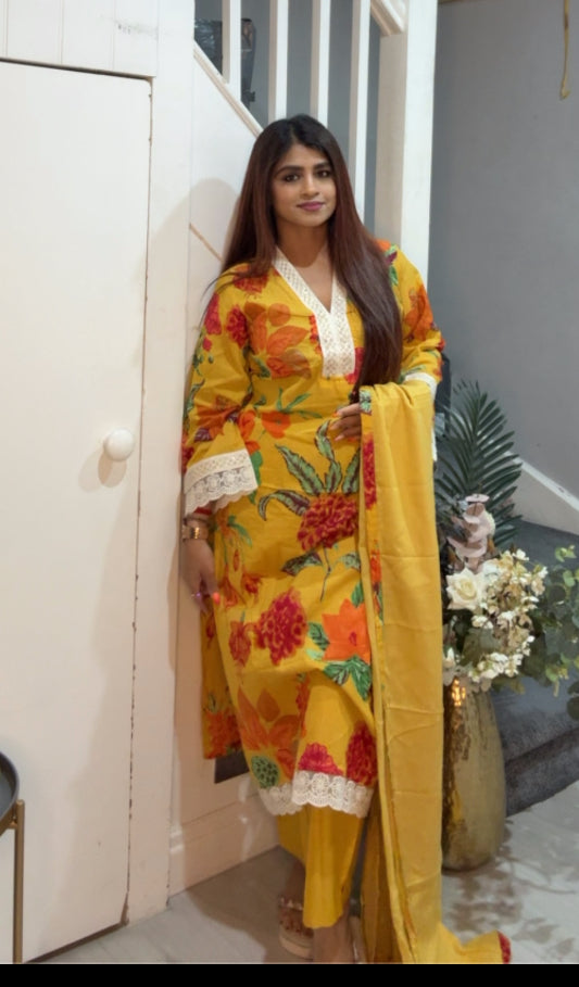 Yellow floral cotton salwar comes with plain cotton pant and Duppatta