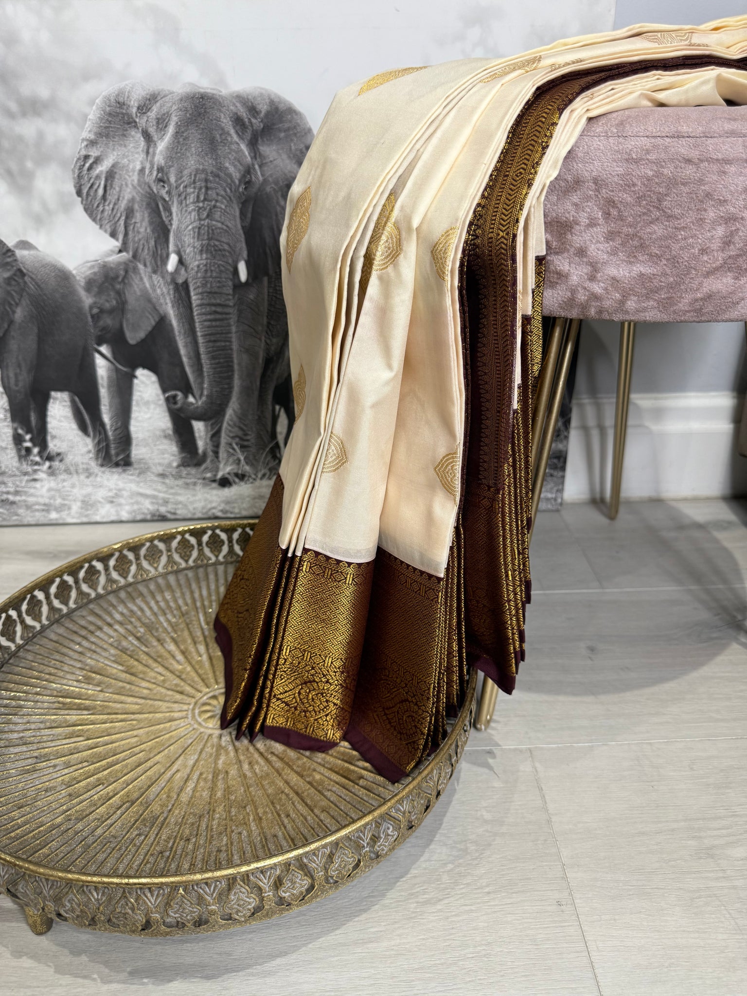 beautiful off white semi silk saree with brown border and brown blouse