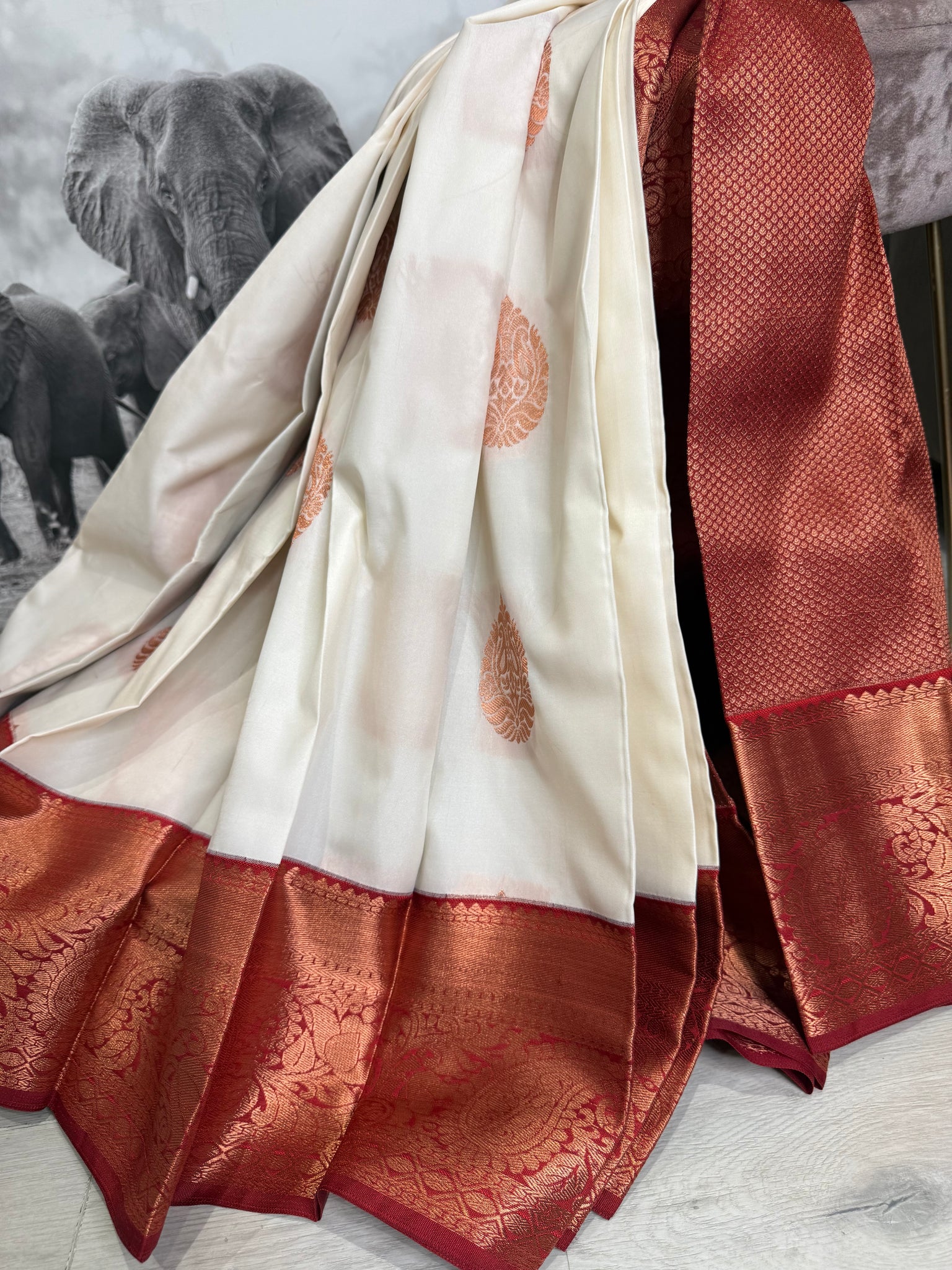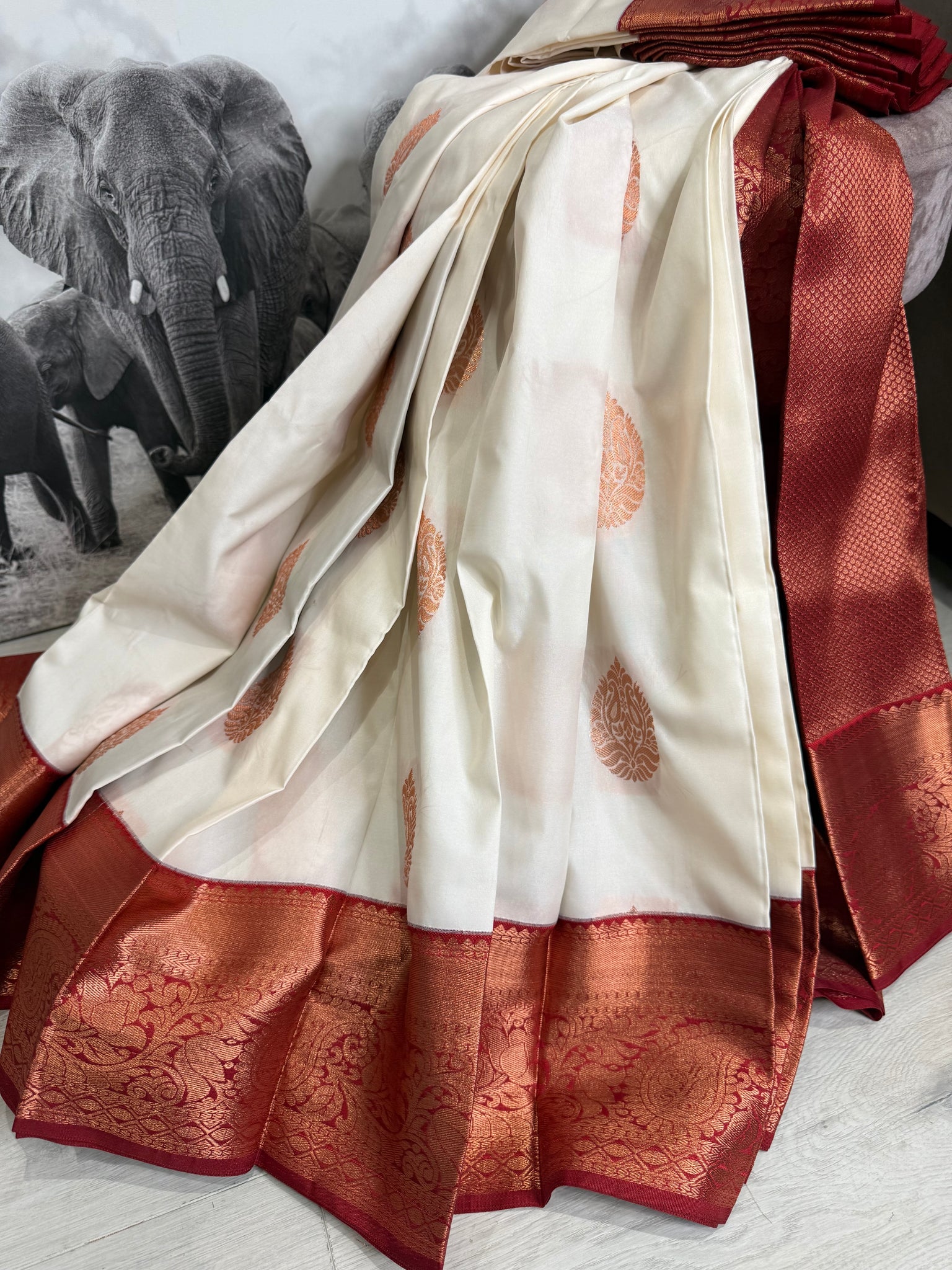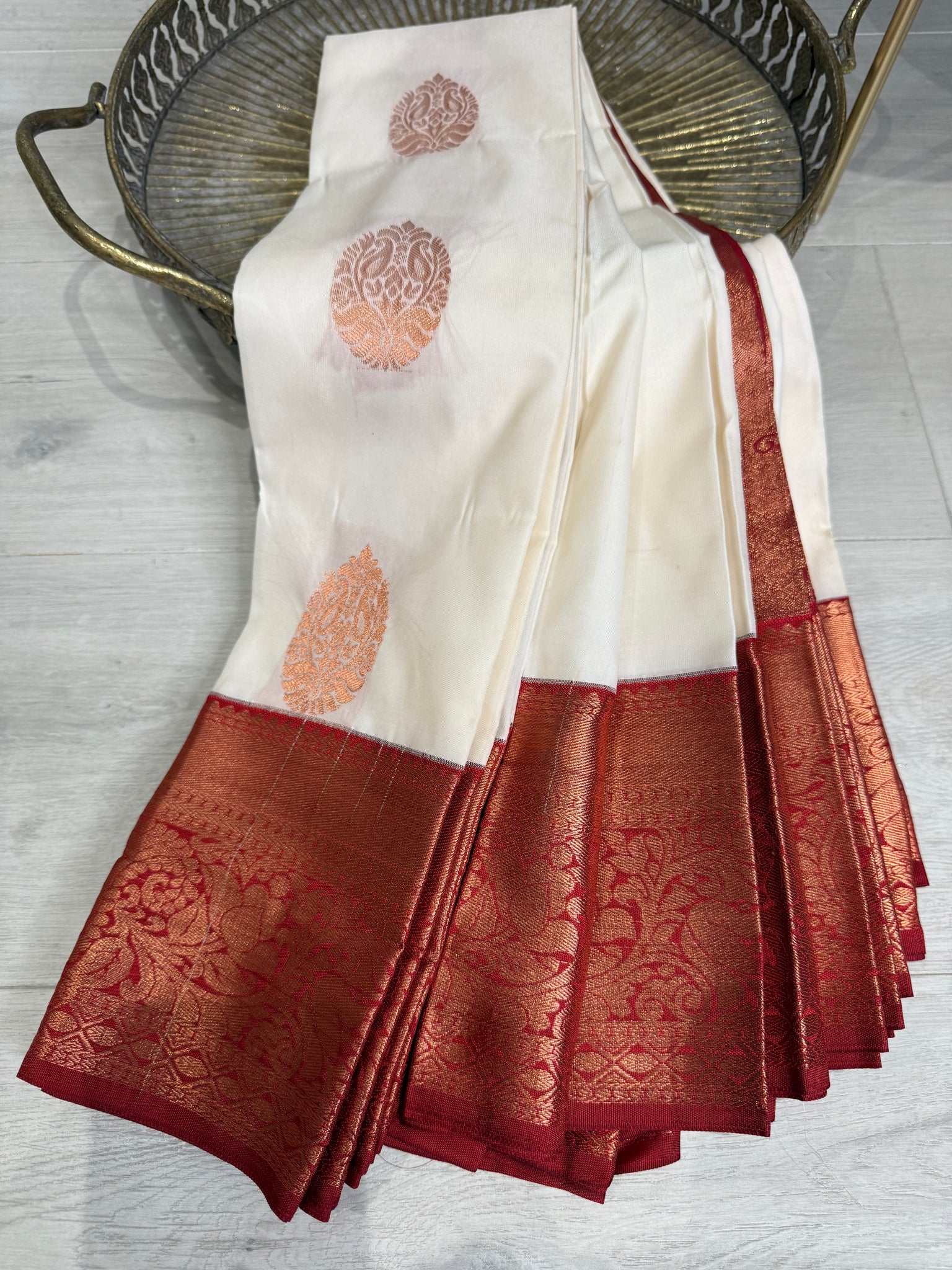 White semi silk saree with dark red border and blouse
