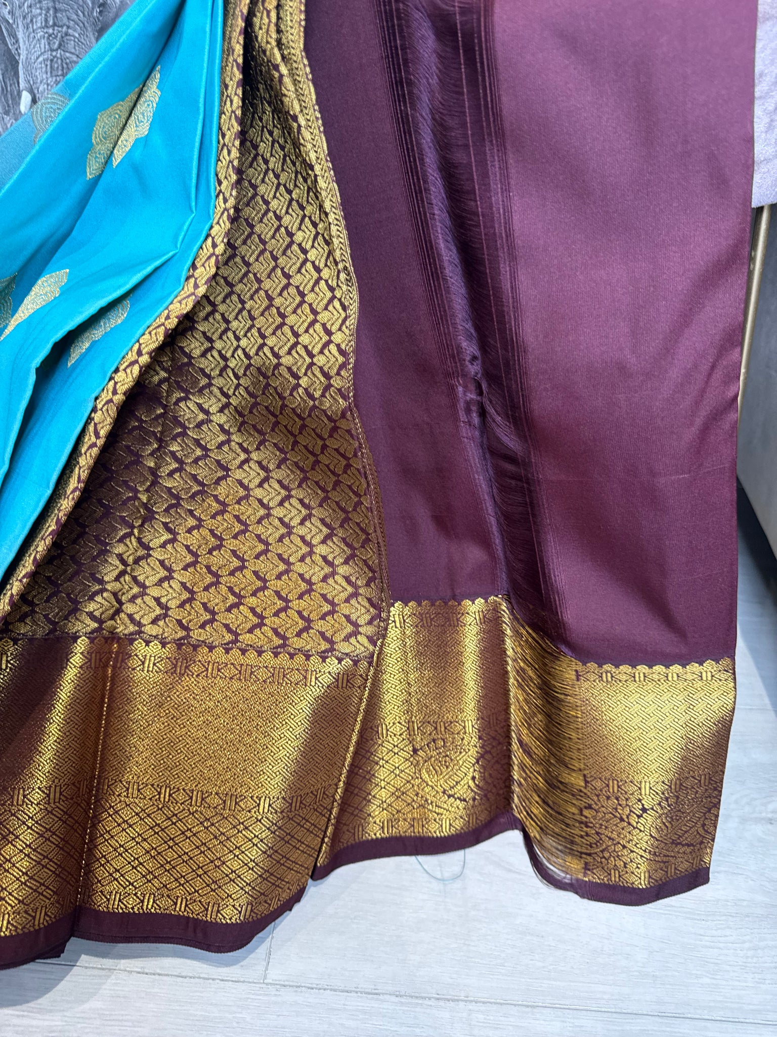 Light blue Semi Kanchi silk Saree with brown border and brown blouse