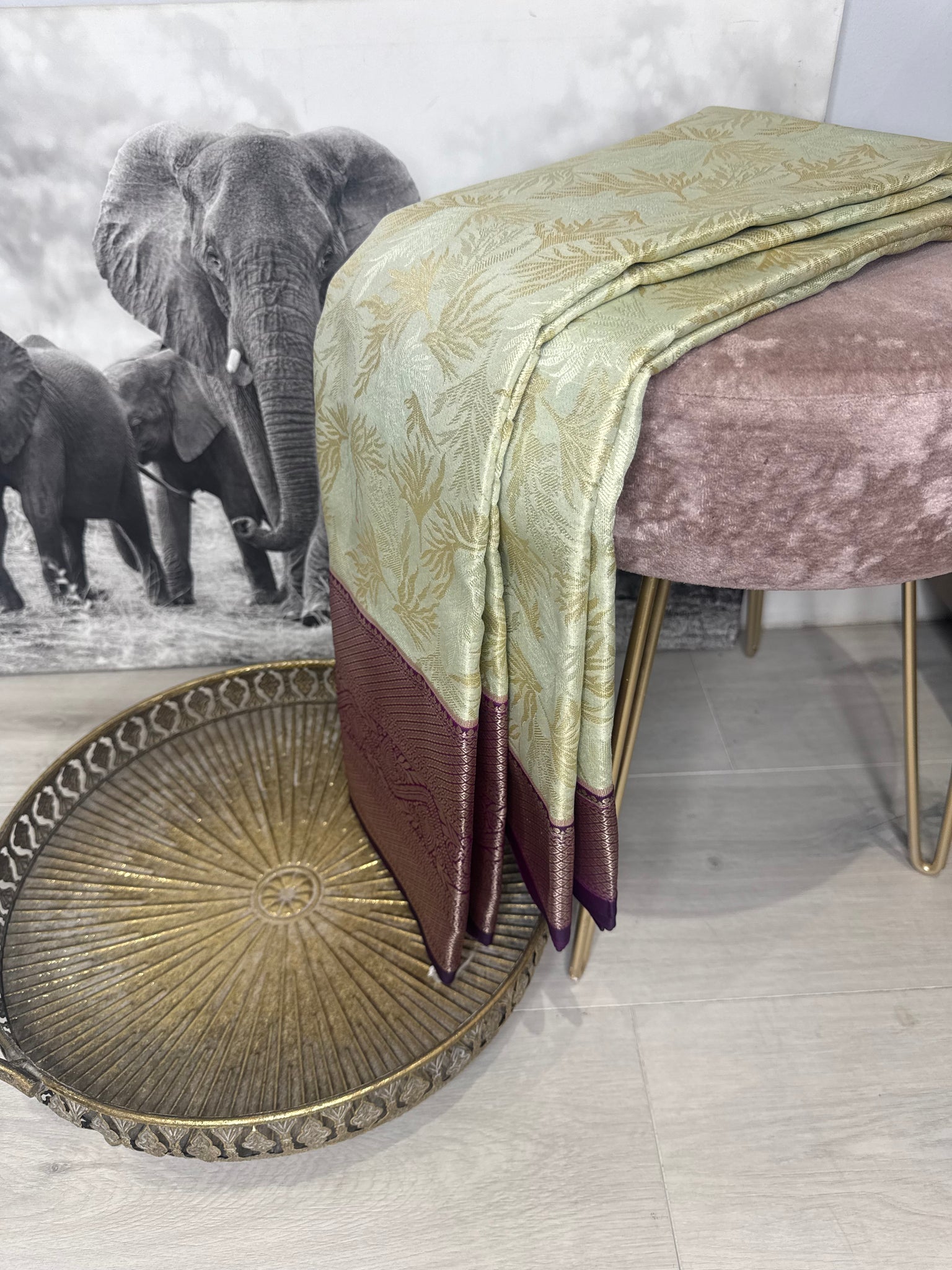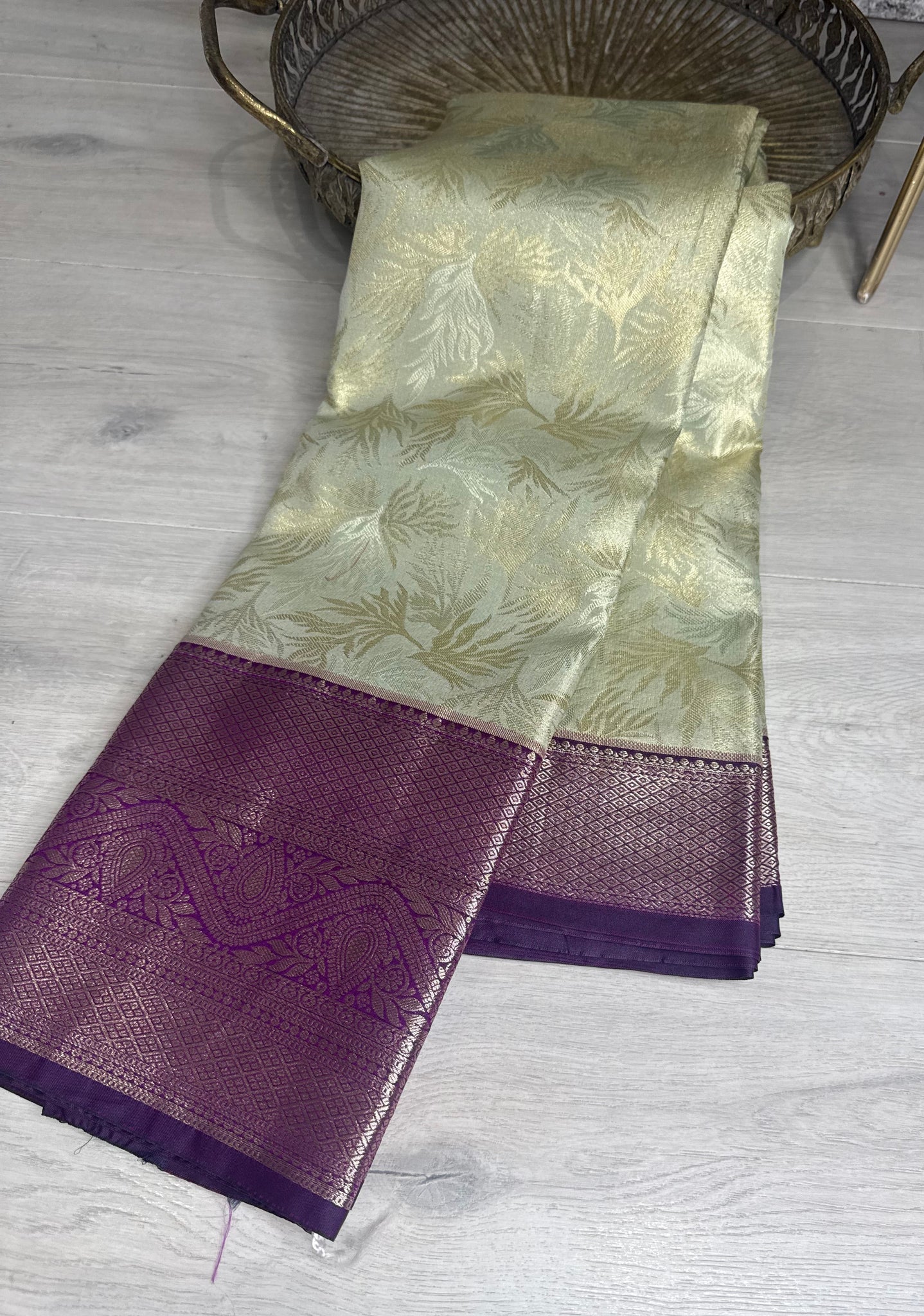 Mint Tissue Kanchipuram silk Saree with purple border and blouse